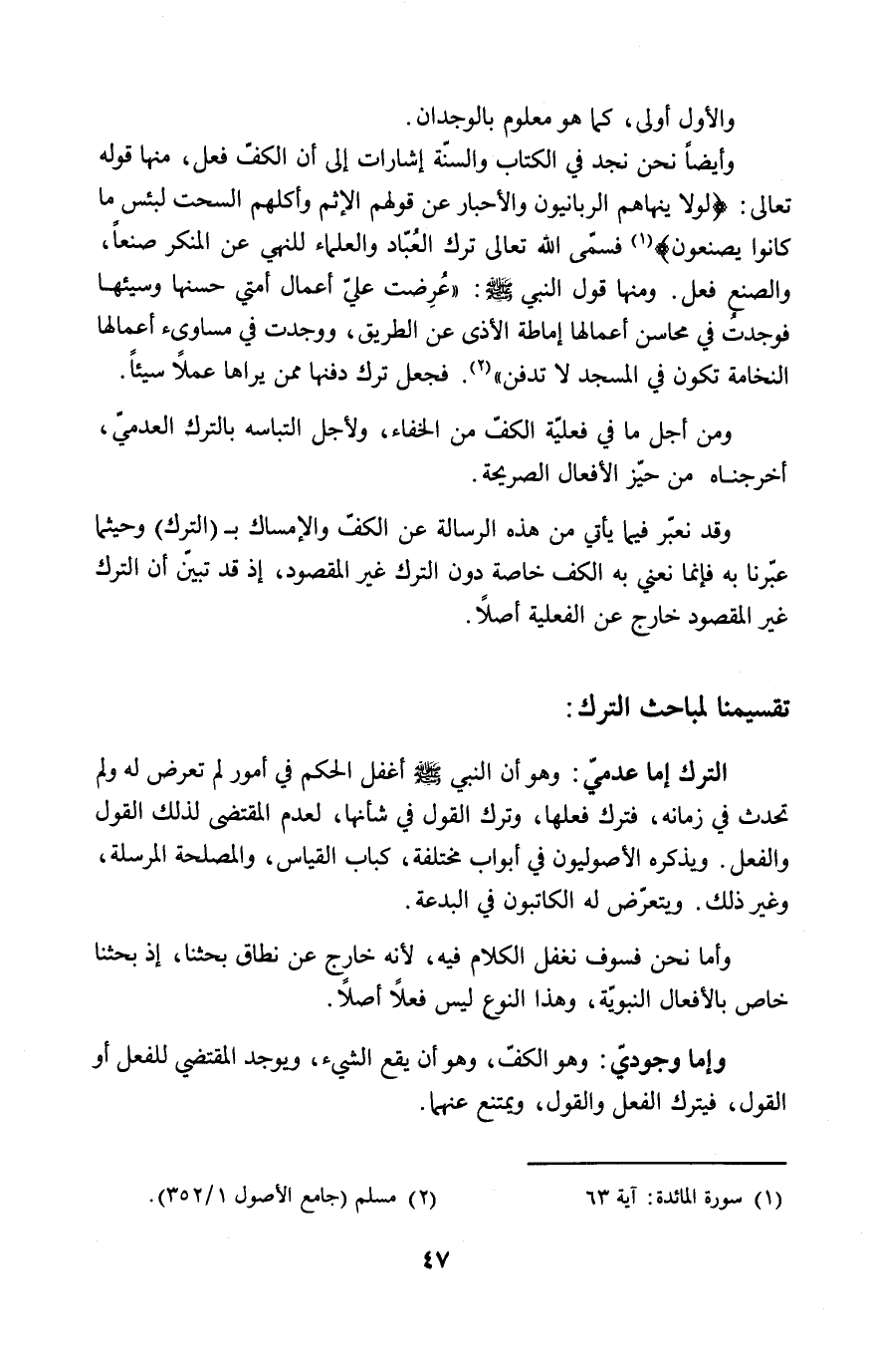 وأيضاً نحن نجد في الكتاب والسنّة إشارات إلى أن الكفّ فعل، منها قوله تعالى: {لولا ينهاهم الربانيون والأحبار عن قولهم الإثم وأكلهم السحت لبئس ما كانوا يصنعون} (١) فسمّى الله تعالى ترك العُبّاد والعلماء للنهي عن المنكر صنعاً، والصنع فعل. ومنها قول النبي - صلى الله عليه وسلم -: "عُرِضت عليّ أعمال أمتي حسنها وسيئها فوجدتُ في محاسن أعمالها إماطة الأذى عن الطريق، ووجدت في مساوئ أعمالها النخامة تكون في المسجد لا تدفن" (٢). فجعل ترك دفنها ممن يراها عملاً سيئاً.