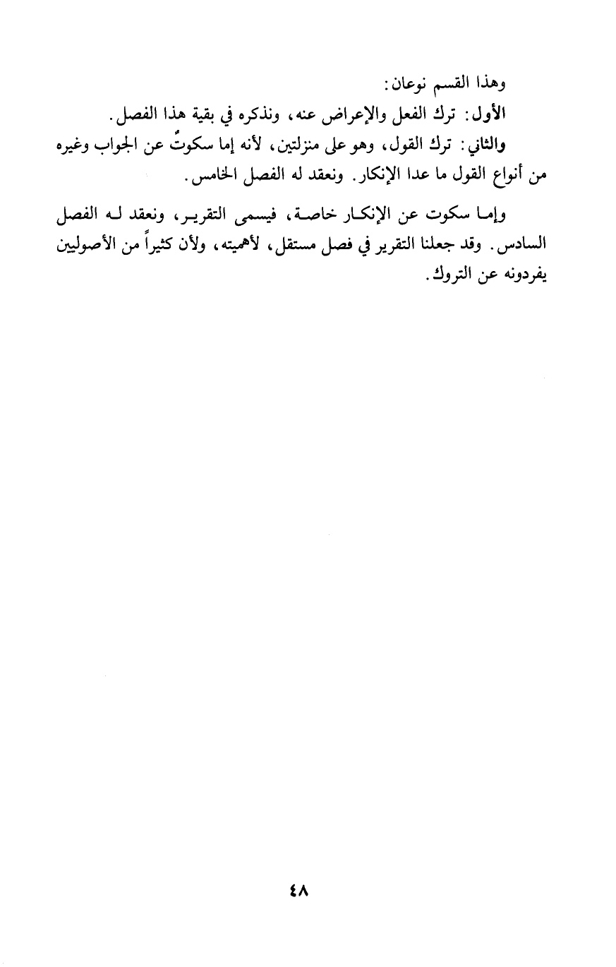 وإما سكوت عن الإنكار خاصة، فيسمى التقرير، ونعقد له الفصل السادس. وقد جعلنا التقرير في فصل مستقل، لأهميته، ولأن كثيراً من الأصوليين يفردونه عن التروك.