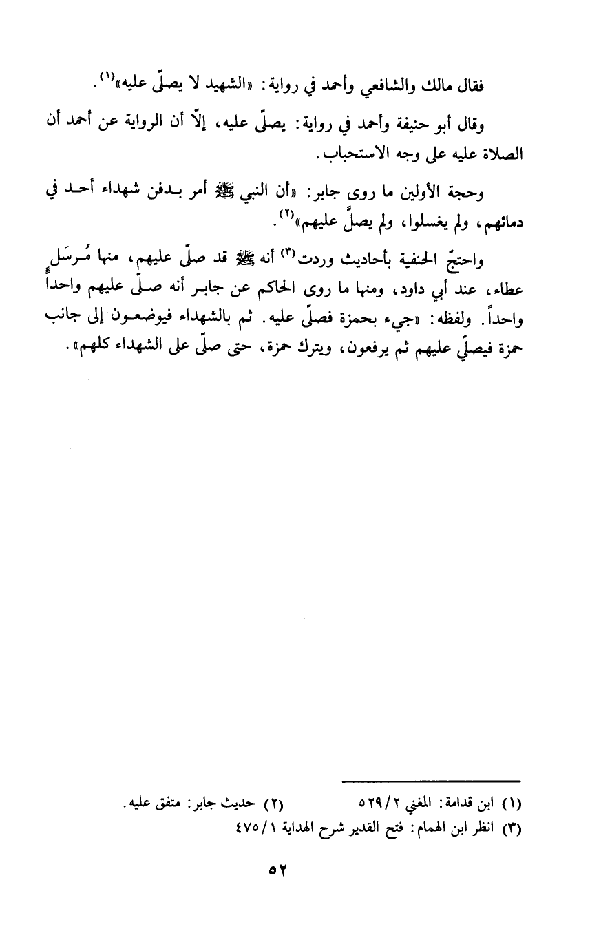وحجة الأولين ما روى جابر: "أن النبي - صلى الله عليه وسلم - أمر بدفن شهداء أحد في دمائهم، ولم يغسلوا، ولم يصلَّ عليهم" (٢).
