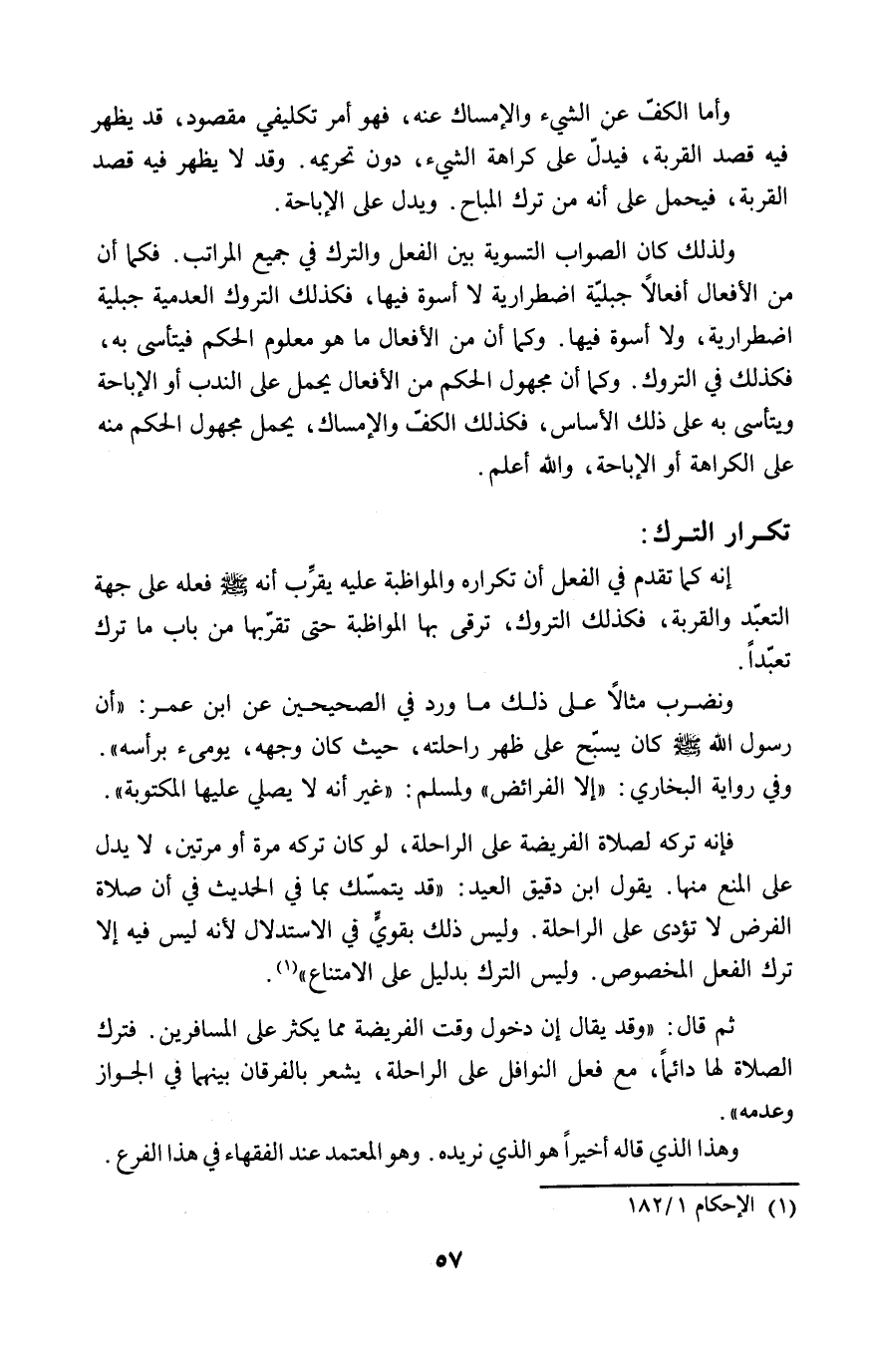 ولذلك كان الصواب التسوية بين الفعل والترك في جميع المراتب. فكما أن من الأفعال أفعالاً جبليّة اضطرارية لا أسوة فيها، فكذلك التروك العدمية جبلية اضطرارية، ولا أسوة فيها. وكما أن من الأفعال ما هو معلوم الحكم فيتأسى به، فكذلك في التروك. وكما أن مجهول الحكم من الأفعال يحمل على الندب أو الإباحة ويتأسى به على ذلك الأساس، فكذلك الكفّ والإمساك، يحمل مجهول الحكم منه على الكراهة أو الإباحة، والله أعلم.