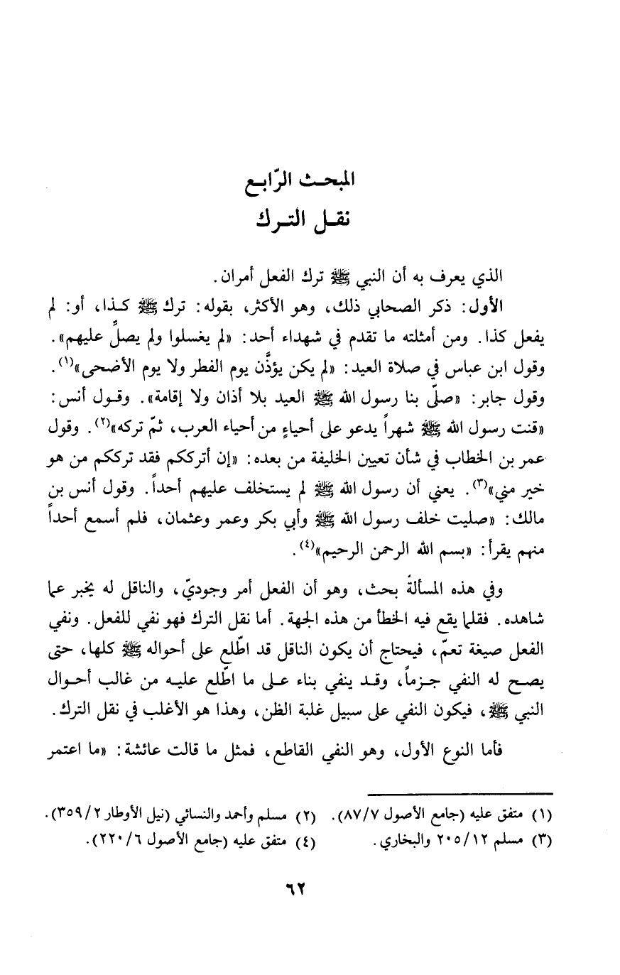الأول: ذكر الصحابي ذلك، وهو الأكثر، بقوله: ترك - صلى الله عليه وسلم - كذا، أو: لم يفعل كذا. ومن أمثلته ما تقدم في شهداء أحد: "لم يغسلوا ولم يصلِّ عليهم". وقول ابن عباس في صلاة العيد: "لم يكن يؤذَّن يوم الفطر ولا يوم الأضحى" (١). وقول جابر: "صلّى بنا رسول الله - صلى الله عليه وسلم - العيد بلا أذان ولا إقامة". وقول أنس: "قنت رسول الله - صلى الله عليه وسلم - شهراً يدعو على أحياءٍ من أحياء العرب، ثمّ تركه" (٢). وقول عمر بن الخطاب في شأن تعيين الخليفة من بعده: "إن أترككم فقد ترككم من هو خير مني" (٣). يعني أن رسول الله - صلى الله عليه وسلم - لم يستخلف عليهم أحداً. وقول أنس بن مالك: "صليت خلف رسول الله - صلى الله عليه وسلم - وأبي بكر وعمر وعثمان، فلم أسمع أحداً منهم يقرأ: "بسم الله الرحمن الرحيم" (٤).