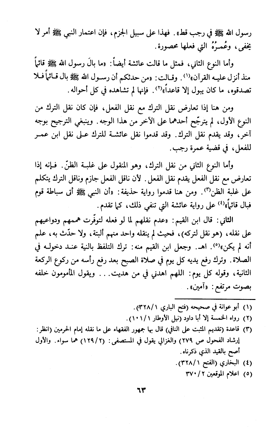 الثاني: قال ابن القيم: "عدم نقلهم لما لو فعله لتوفّرت هممهم ودواعيهم على نقله، (هو نقل لتركه)، فحيث لم ينقله واحد منهم ألبتة، ولا حدّث به، علم أنه لم يكن" (٥). اهـ. وجعل ابن القيم منه: ترك التلفظ بالنية عند دخوله في الصلاة. وترك رفع يديه كل يوم في صلاة الصبح بعد رفع رأسه من ركوع الركعة الثانية، وقوله كل يوم: اللهم اهدني في من هديت ... ويقول المأمومون خلفه بصوت مرتفع: "آمين".