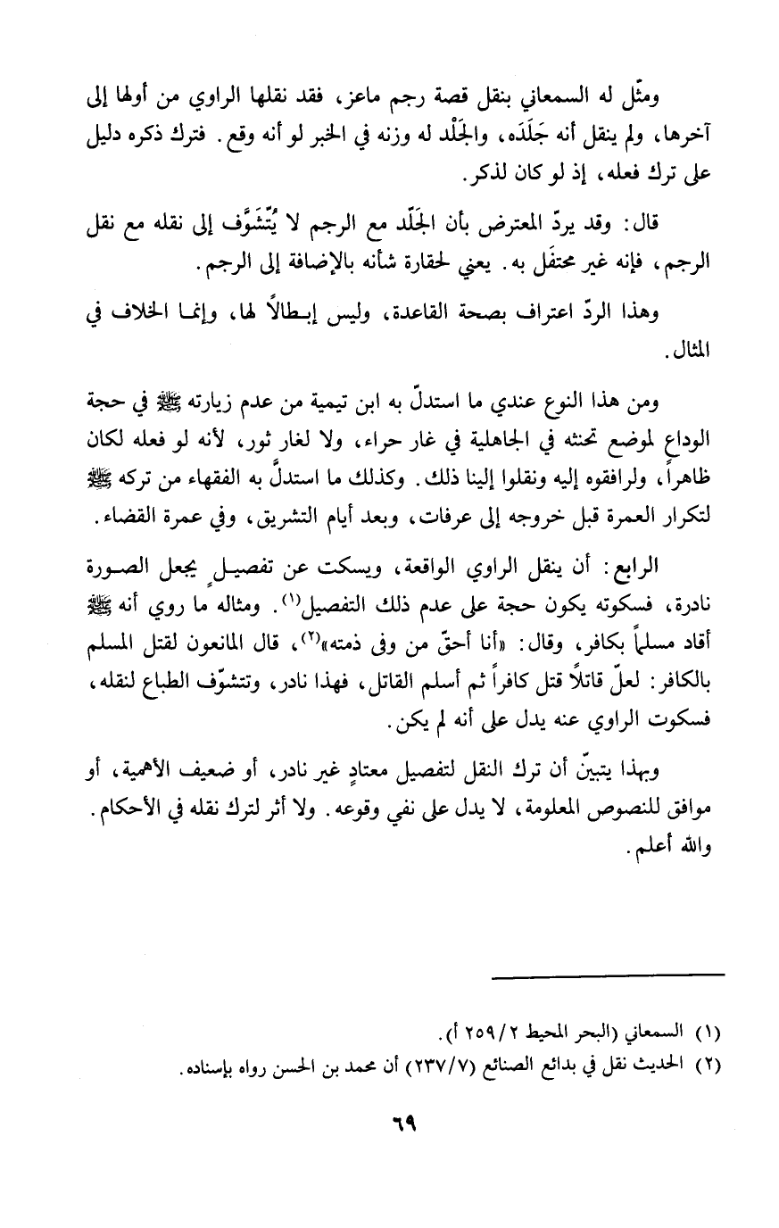 الرابع: أن ينقل الراوي الواقعة، ويسكت عن تفصيلٍ يجعل الصورة نادرة، فسكوته يكون حجة على عدم ذلك التفصيل (١). ومثاله ما روي أنه - صلى الله عليه وسلم - أقاد مسلماً بكافر، وقال: "أنا أحقّ من وفى ذمته" (٢)، قال المانعون لقتل المسلم بالكافر: لعلّ قاتلاً قتل كافراً ثم أسلم القاتل، فهذا نادر، وتتشوّف الطباع لنقله، فسكوت الراوي عنه يدل على أنه لم يكن.