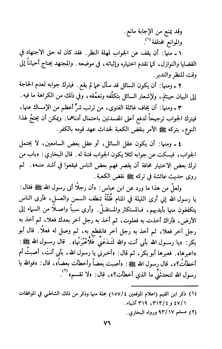٣ - ومنها: أن يخاف غائلة الفتوى، من ترتب شرٍّ أعظم من الإمساك عنها، فيترك الجواب ترجيحاً لدفع أعلى المفسدتين باحتمال أدناهما. ويمكن أن يحتجّ لهذا النوع، بتركه - صلى الله عليه وسلم - الأمر بنقض الكعبة لحداث عهد قومه بالكفر.