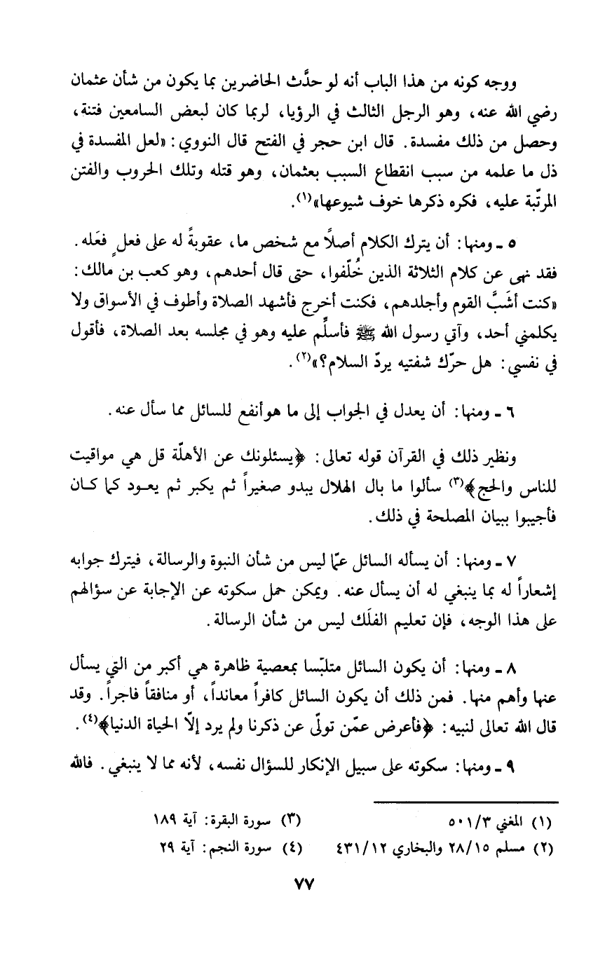 ٩ - ومنها: سكوته على سبيل الإنكار للسؤال نفسه، لأنه مما لا ينبغي. فالله
