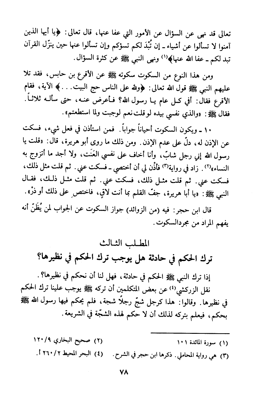 إذا ترك النبي - صلى الله عليه وسلم - الحكم في حادثة، فهل لنا أن نحكم في نظيرها؟. نقل الزركشي (٤) عن بعض المتكلمين أن تركه - صلى الله عليه وسلم - يوجب علينا ترك الحكم في نظيرها. وقالوا: هذا كرجل شجّ رجلاً شجة، فلم يحكم فيها رسول الله - صلى الله عليه وسلم - بحكم، فيعلم بتركه لذلك أن لا حكم لهذه الشجّة في الشريعة.