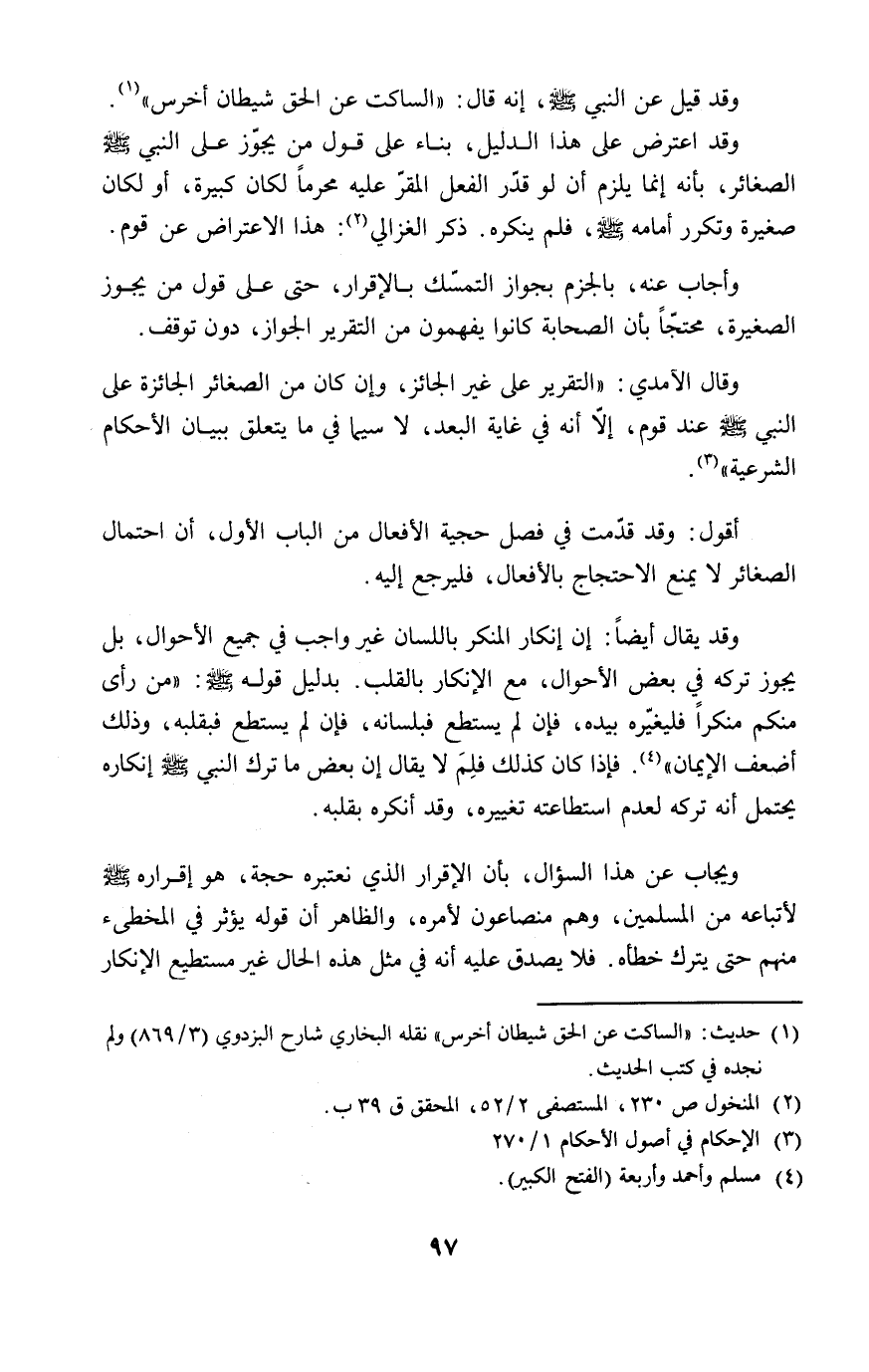 وقال الآمدي: "التقرير على غير الجائز، وإن كان من الصغائر الجائزة على النبي - صلى الله عليه وسلم - عند قوم، إلا أنه في غاية البعد، لا سيما في ما يتعلق ببيان الأحكام الشرعية" (٣).