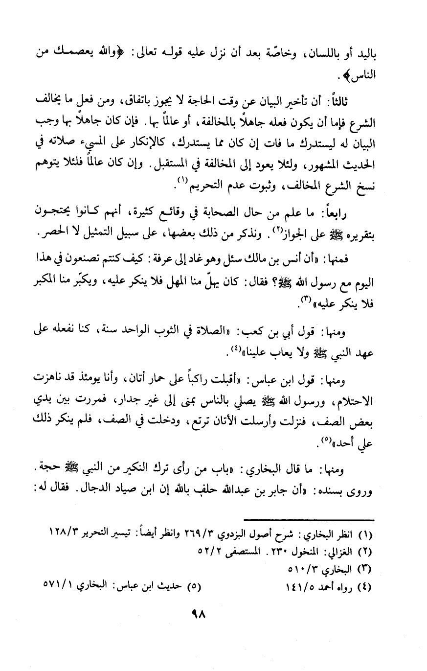 ثالثاً: أن تأخير البيان عن وقت الحاجة لا يجوز باتفاق، ومن فعل ما يخالف الشرع فإما أن يكون فعله جاهلاً بالمخالفة، أو عالماً بها. فإن كان جاهلاً بها وجب البيان له ليستدرك ما فات إن كان مما يستدرك، كالإنكار على المسيء صلاته في الحديث المشهور، ولئلا يعود إلى المخالفة في المستقبل. وإن كان عالماً فلئلا يتوهم نسخ الشرع المخالف، وثبوت عدم التحريم (١).
