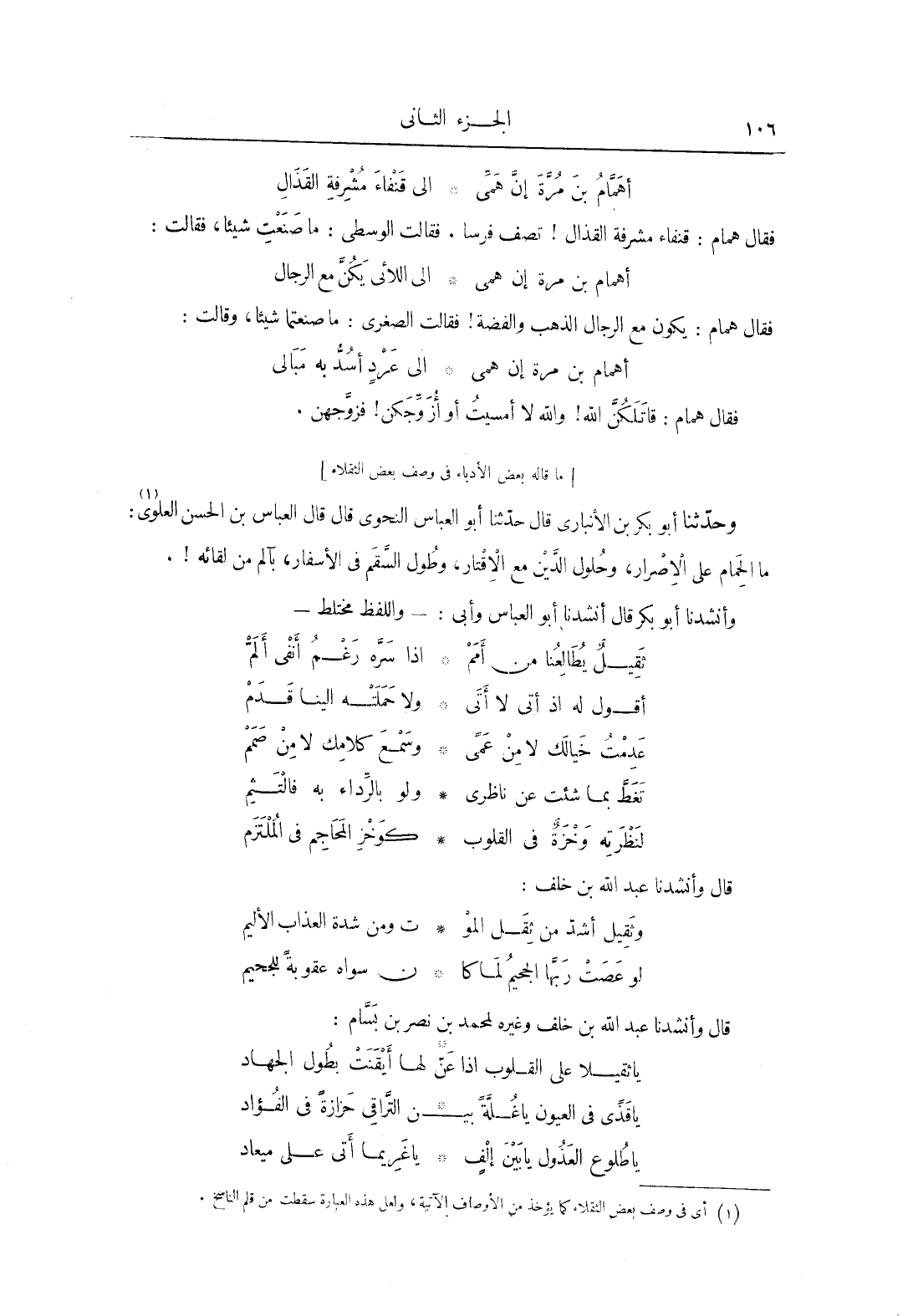 وحَدَّثَنَا أَبُو بَكْرِ بن الأنبارى، قَالَ: حَدَّثَنَا أَبُو العباس النحوي، قَالَ: قَالَ العباس بن الحسن العلوي: ما الحمام عَلَى الإصرار، وحلول الدّين مع الإقتار، وطول السّقم فِي الأسفار، بآلم من لقائه!