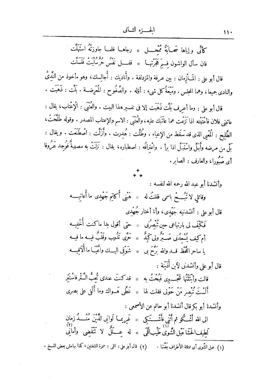 : وما أعرف بلّت ذهبت إلا فِي تفسير هذا البيت، والعتبي: الإعتاب، يُقَال: عاتبني فلان فاعتبته إذا نزعت عما عاتبك عليه، والعتبى: الإسم والإعتاب المصدر، وقوله طلحت، الطليح: المعى الذي قد سقط من الإعياء، وطلّت: هدرت، وأزلّت: اصطنعت، ويقَالَ: بلّ من مرضه وأبلّ واستبلّ إذا برأ، واعترافه: اصطباره، يُقَال: نزلت به مصيبةٌ فوجد عروفاً أي صبورا، والعارف: الصابر