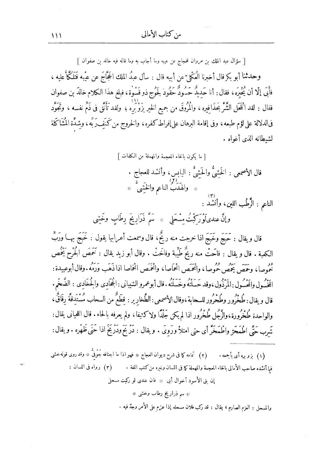 وحَدَّثَنَا أَبُو بَكْرٍِ، قَالَ: أَخْبَرَنَا العكلي، عَنْ أبيه، قَالَ: سأل عبد الملك الحجّاج، عَنْ عيبه فتلكأ عليه، فأبى إلا أن يخبره، فقَالَ: أنا حديدٌ حسودٌ حقودٌ لجوج ذو قسوة، فبلغ هذا الكلام خالد بن صفوان، فقَالَ: لقد انتحل الشّر بحذافيره، والمروق من جميع الخير بزوبره، ولقد تأنق فِي ذم نفسه، وتجود فِي الدلالة عَلَى لؤم طبعه، وفي إقامة البرهان عَلَى إفراط كفره، والخروج من كنف ربّه، وشدّة المشاكلة لشيطانه الذي أغواه
