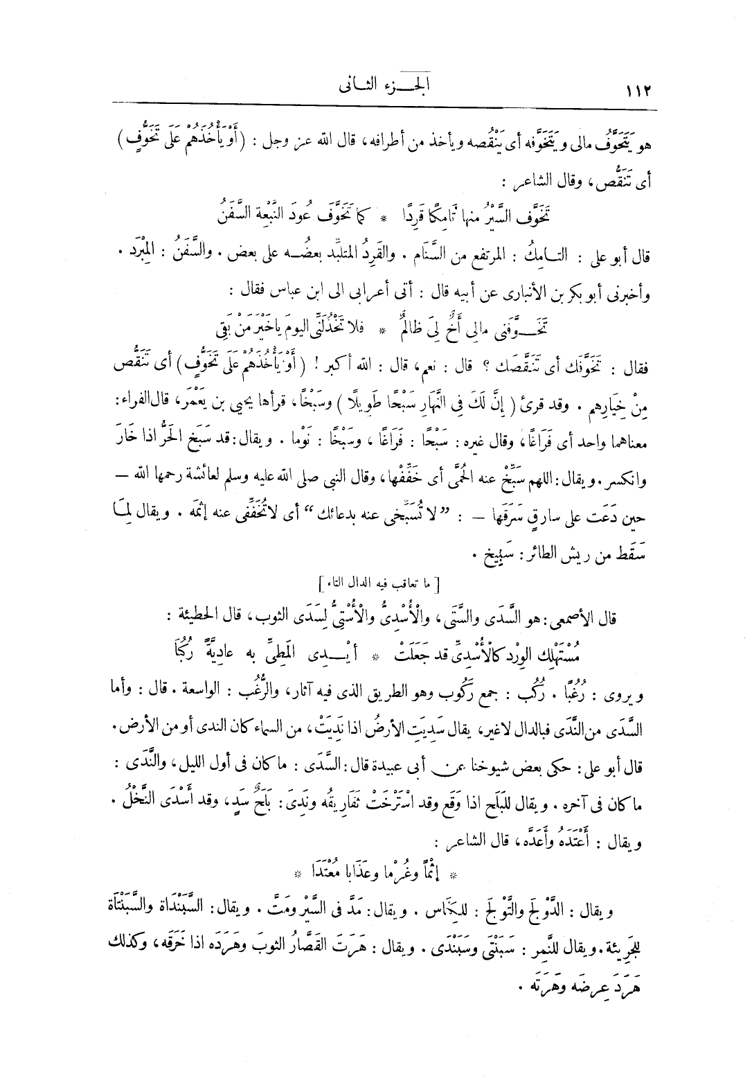 فقَالَ: تخوّفك أي تنقّصك؟ قَالَ: نعم، قَالَ: الله أكبر! {أَوْ يَأْخُذَهُمْ عَلَى تَخَوُّفٍ} [النحل: 47] أي تنقّص من خيارهم، وقد قرئ {إِنَّ لَكَ فِي النَّهَارِ سَبْحًا طَوِيلا} [المزمل: 7] وسبخاً قرأها يحيى بن يعمر، قَالَ الفراء: معناهما واحد أي فراغاً، وقَالَ غيره: سبحاً: فراغاً، وسبخاً: نوماً، ويقَالَ: قد سبخ الحرّ إذا خار وانكسر، ويقَالَ: اللهم سبّخ عنه الحمى أي خفّفها، وقَالَ النَّبِيّ صَلَّى اللهُ عَلَيْهِ وَسَلَّمَ لعائشة رحمها الله، حين دعت عَلَى سارقٍ سرقها: لا تسبّخي عنه بدعائك أي لا تخففي عنه إثمه، ويقَالَ لما سقط من ريش الطائر: سبيخ.