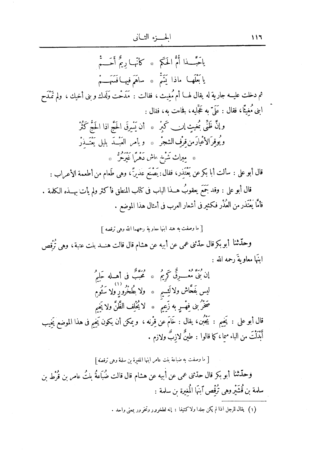 وحَدَّثَنَا أَبُو بَكْرٍ، قَالَ: حَدَّثَنِي عمى، عَنْ أبيه، عَنْ هشام، قَالَ: قَالَت ضباعة بنت عامر بن قرط بن سلمة بن قشير وهي ترقص ابنها المغيرة بن سلمة