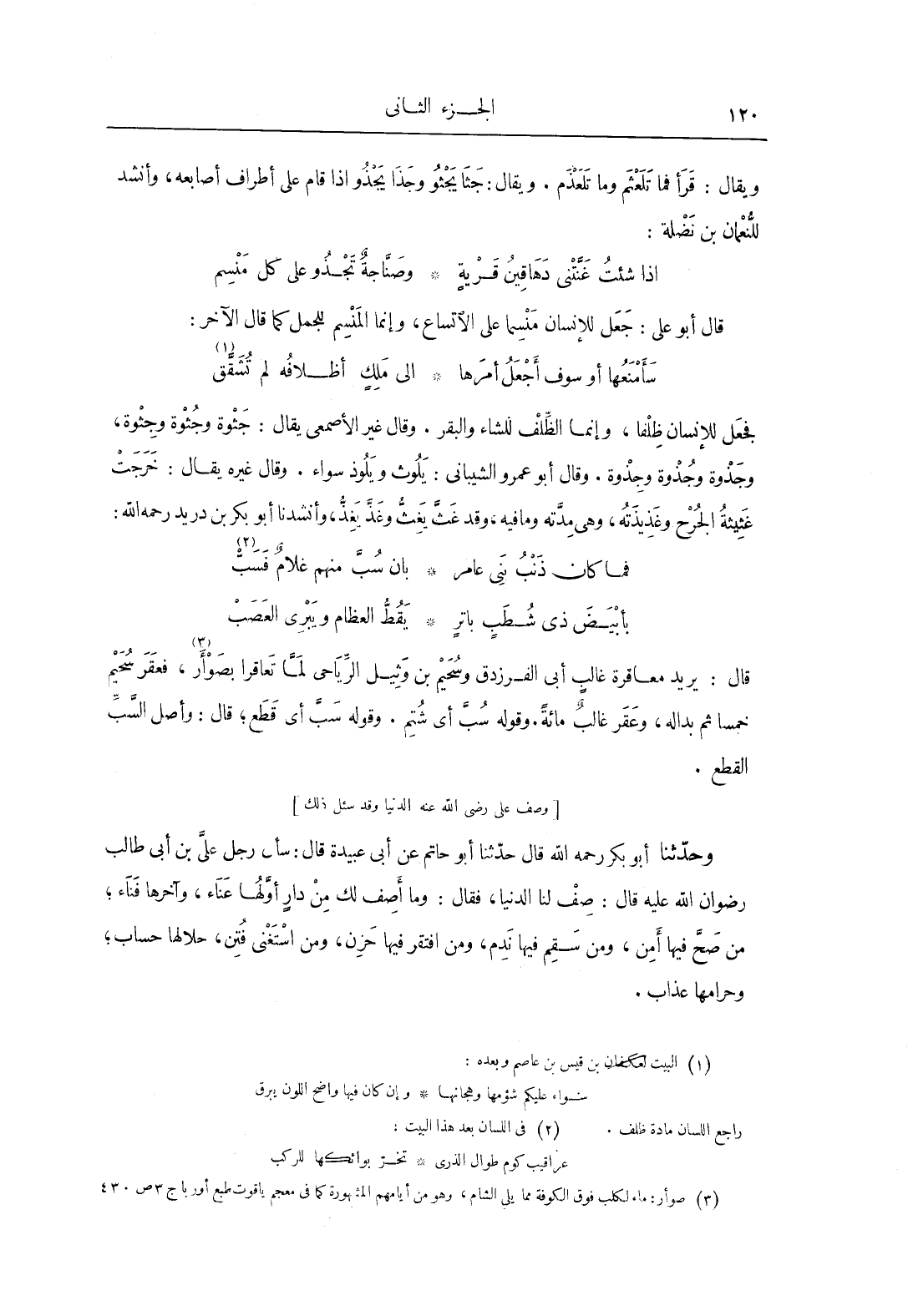 وحَدَّثَنَا أَبُو بَكْرٍِ، رَحِمَهُ اللَّهُ، قَالَ: حَدَّثَنَا أَبُو حَاتِمٍ، عَنْ أَبِي عُبَيْدَةَ، قَالَ: سَأَلَ رَجُلٌ عَلِيَّ بْنَ أَبِي طَالِبٍ، رِضْوَانُ اللَّهِ عَلَيْهِ، قَالَ: صِفْ لَنَا الدُّنْيَا، فَقَالَ: «وَمَا أَصِفُ لَكَ مِنْ دَارٍ أَوَّلُهَا عَنَاءٌ، وَآخِرُهَا فَنَاءٌ، مَنْ صَحَّ فِيهَا أَمِنَ، وَمَنْ سَقِمَ فِيهَا نَدِمَ، وَمَنِ افْتَقَرَ فِيهَا حَزِنَ، وَمَنِ اسْتَغْنَى فُتِنَ، حَلالُهَا حِسَابٌ، وَحَرَامُهَا عَذَابٌ»