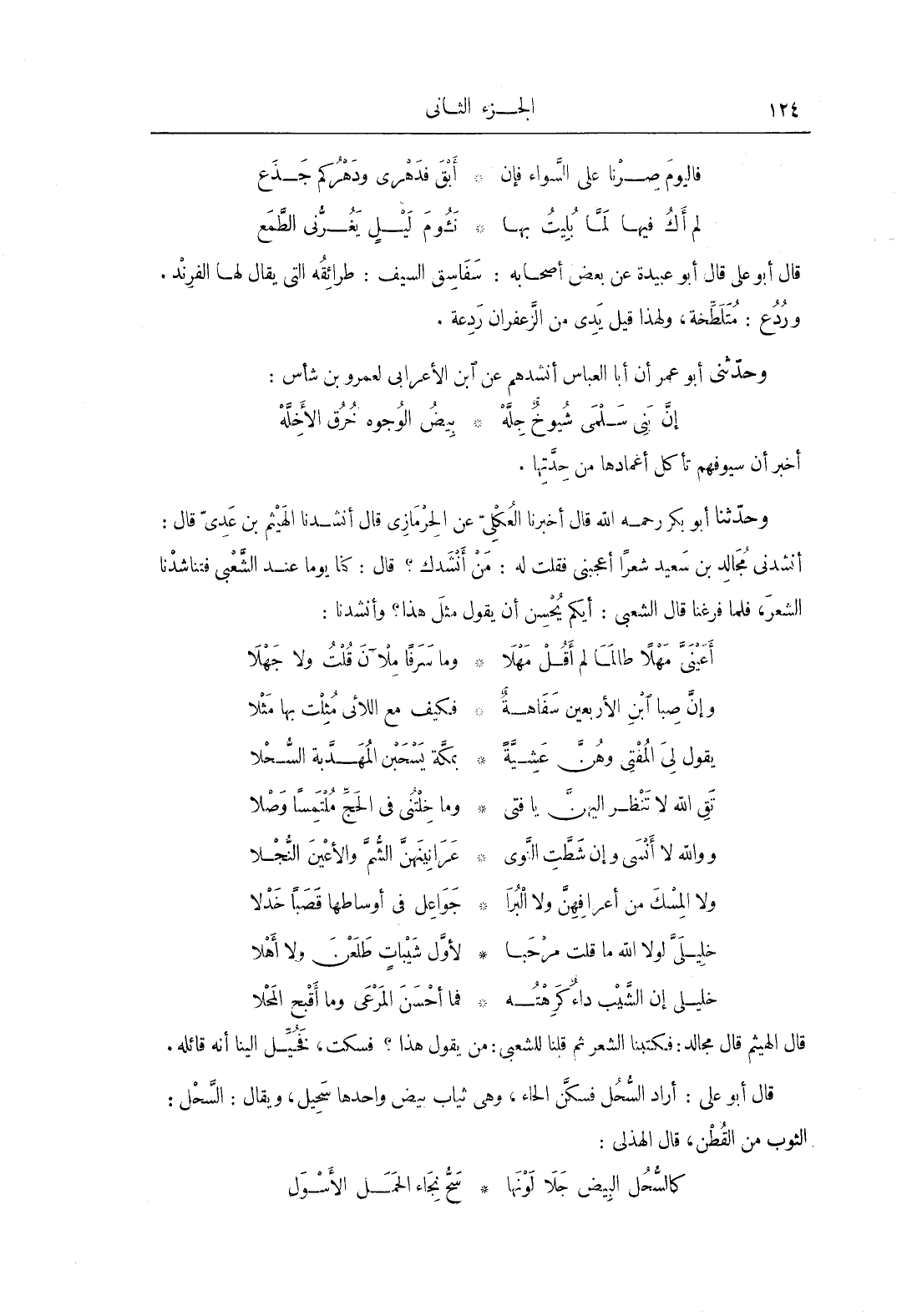 وحَدَّثَنَا أَبُو بَكْرٍِ، رحمه الله، قَالَ: أَخْبَرَنَا العكلي، عَنِ الحرمازي، قَالَ: أنشدنا الهيثم بن عدي، قَالَ: أنشدني مجالد بن سعيد شعراً أعجبني فقلت له: من أنشدك؟ قَالَ: كنا يوم عند الشعبي فتناشدنا الشعر، فلما فرغنا قَالَ الشعبي: أيكم يحسن أن يقول مثل هذا؟ وأنشدنا:
