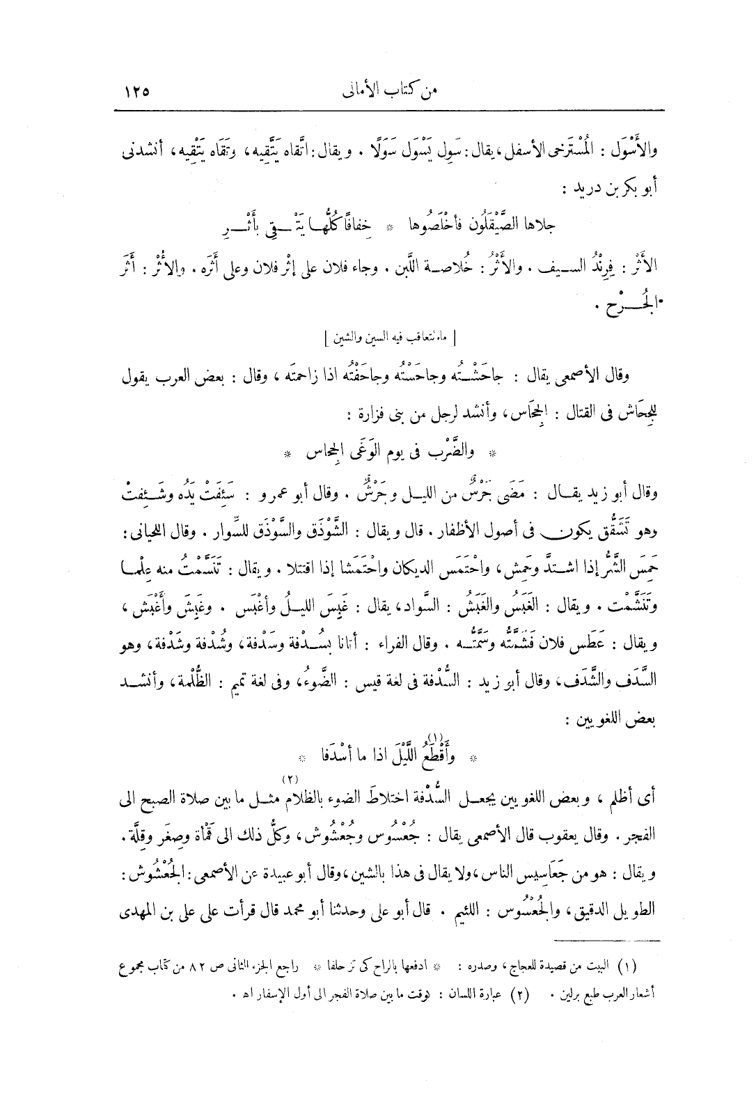 وقَالَ أَبُو زيد يُقَال: مضى جرسٌ من الليل وجرشٌ، وقَالَ أَبُو عمرو: سئفت يده وشئفت وهو تشقق يكون فِي أصول الأظفار، قَالَ: ويقَالَ: الشوذق والسوذق للسوار، وقَالَ اللحياني: خمس الشر إذا اشتد وحمش، واحتمس الديكان واحتمشا إذا اقتتلا، ويقَالَ: تنسمت منه علماً وتنشمت، ويقَالَ: الغبس والغبش: السواد، يُقَال: غبس الليل واغبس، وغبش وأغبش، ويقَالَ: عطس فلان فشمّتّه وسمّتّه، وقَالَ الفراء: أتانا بسَدفة وسُدفة، وشَدفة وشُدفة، وهو السَّدف والشَّدف، وقَالَ أَبُو زيد: السُّدفة فِي لغة قيس: الضوء، وفي لغة تميم: الظلمة، وأنشد بعض اللغويين.