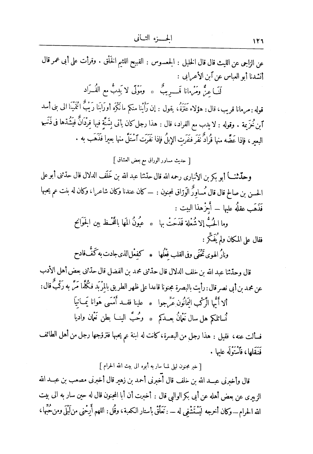 وحَدَّثَنَا أَبُو بَكْرِ بن الأنبارى، رحمه الله، قَالَ: حَدَّثَنَا عبد الله بن خلف الدلال، قَالَ: حَدَّثَنِي أَبُو عَلَى الحسن بن صالح، قَالَ: قَالَ مساورٌ الوراق لمجنون: كان عندنا وكان شاعراً، وكان له بنت عم يحبها فذهب عقله عليها، أجز هذا البيت: وما الحب إلا شعلة قدحت بها عيون المها باللحظ بين الجوانح فقَالَ عَلَى المكان ولم يفكر: