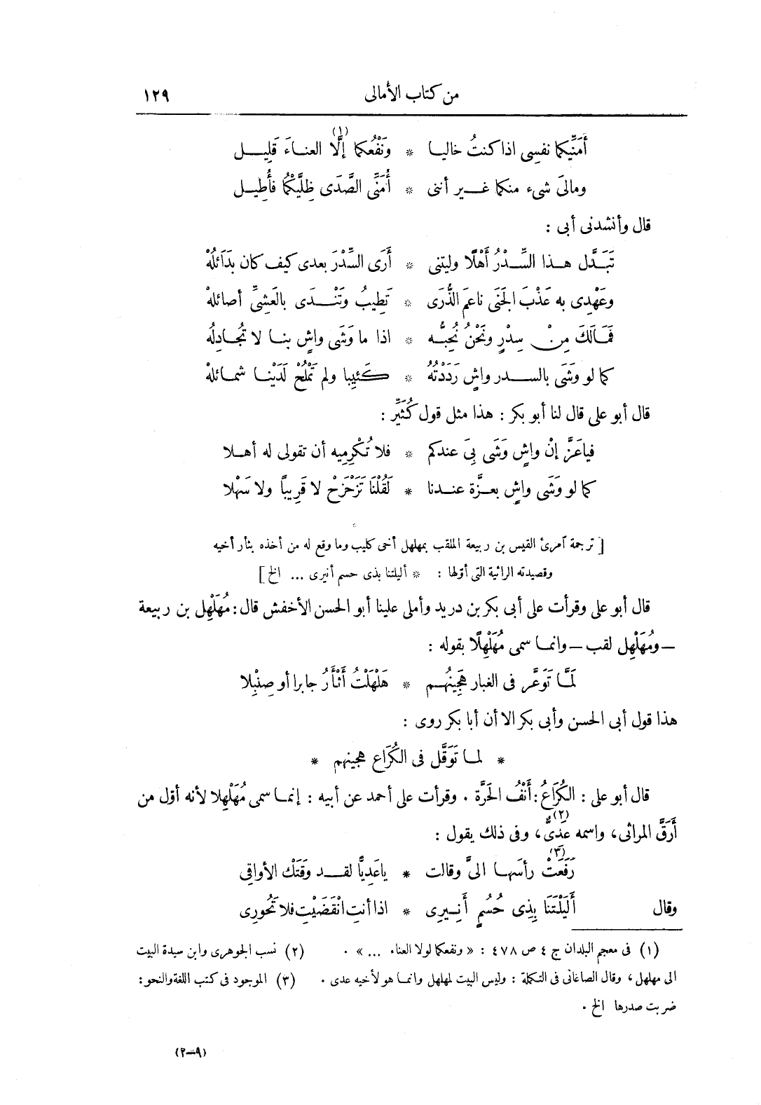 ترجمة امرئ القيس بن ربيعة الملقب بمهلهل أخي كليب، وما وقع له من أخذه بثأر أخيه وقصيدته الرائية التي أولها: أليتنا بذي حسم أنيرى. . . . . الخ
