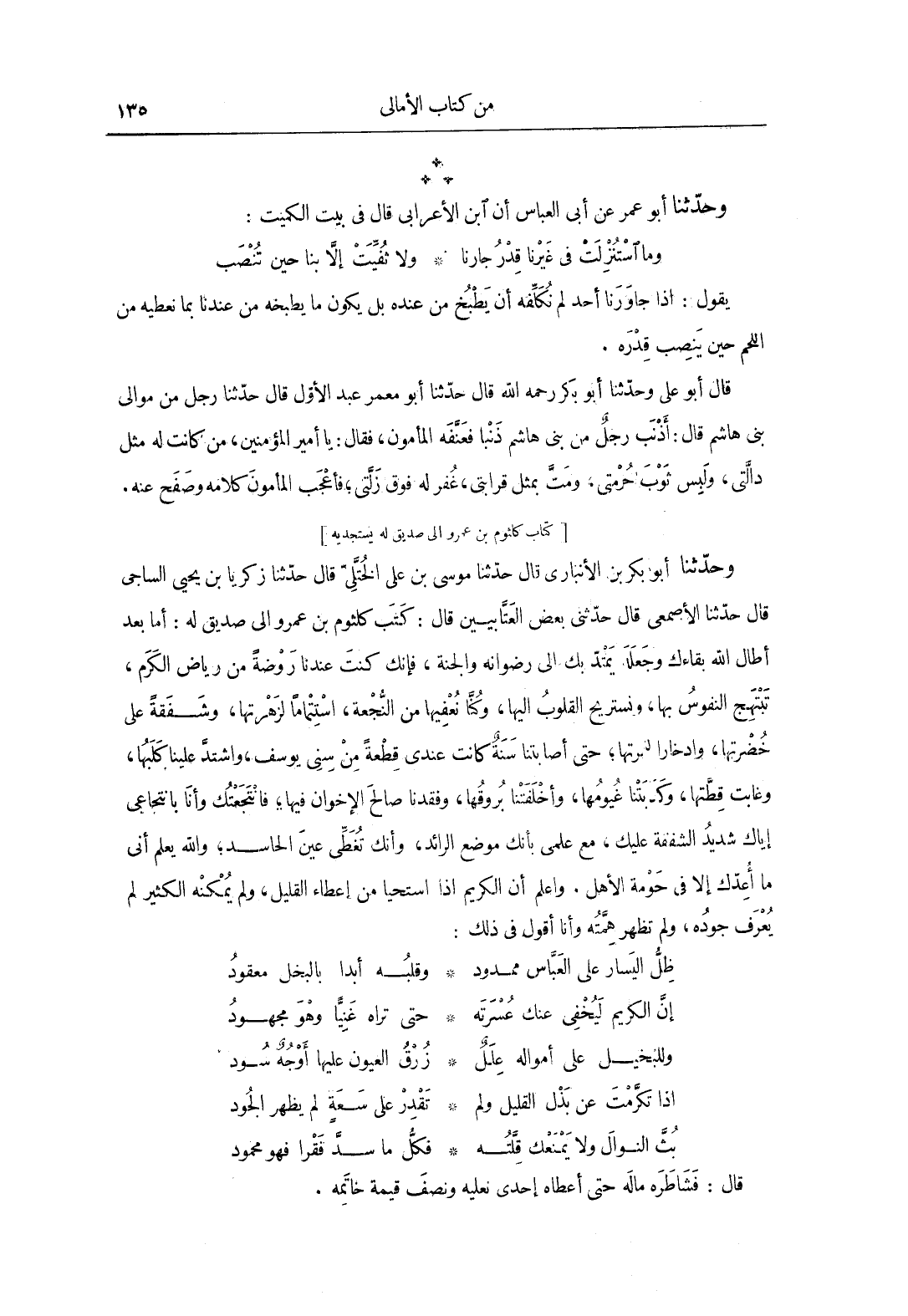 وحَدَّثَنَا أَبُو بَكْرِ بن الأنباري، قَالَ: حَدَّثَنَا موسى بن عَلَى الختّليّ، قَالَ: حَدَّثَنَا زكريا بن يحيى الساجي، قَالَ: حَدَّثَنَا الأصمعي، قَالَ: حَدَّثَنِي بعض العتّابيين قَالَ: كتب كلثوم بن عمرو إِلَى صديق له: أما بعد أطال الله بقاءك، وجعله يمتدّ بك إِلَى رضوانه والجنة، فإنك كنت عندنا روضةً من رياض الكرم، تبتهج النفوس بها، وتستريح القلوب إليها، كنا نعفيها من النّجعة، استتماماً لزهرتها، وشفقةً عَلَى خضرتها، وادخاراً لثمرتها، حتى أصابتنا سنةٌ كانت عندي قطعةً من سني يوسف، واشتدّ علينا كلبها، وغابت قطتها، وكذبتنا غيومها، وأخلقتنا بروقها، وفقدنا صالح الإخوان فيها، فانتجعتك، وأنا بانتجاعي إياك شديد الشفقة عليك، مع علمي بأنك موضع الرائد، وأنك تغطّي عين الحاسد، والله يعلم أني ما أعدك إلا فِي حومة الأهل، واعلم أن الكريم إذا استحيا من إعطاء القليل، ولم يمكنه الكثير لم يعرف جوده، ولم تظهر همّته، وأنا أقول فِي ذلك: