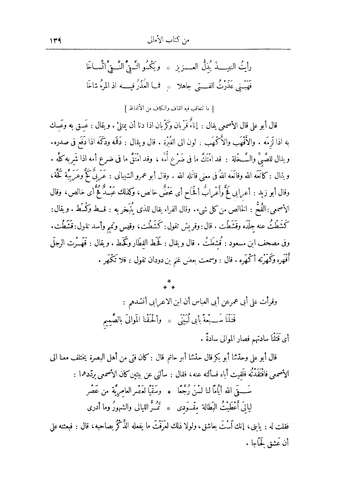 قَالَ الأصمعي: يُقَال: إناءٌ قربان وكربان إذا دنا ان يمتلئ، ويقَالَ: عسق به وعسك به إذا لزمه، والأقهب والأكهب: لون إِلَى قَالَ: ويقَالَ: دقمه ودكمه إذا دفع فِي صدره ويقَالَ للصّبيّ والسخلة: قد امتكّ ما فِي ضرع أمّه، وقد امتقّ ما فِي ضرع أمه إذا شربه كلّه.