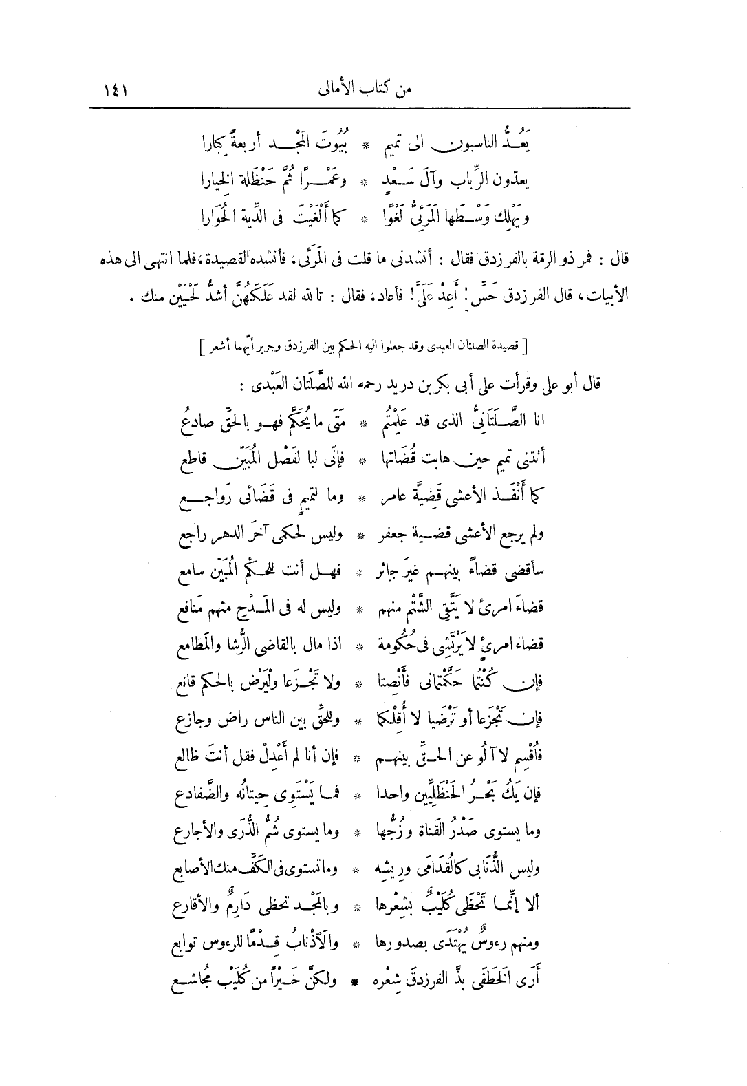 يعد الناسبون إِلَى تميم بيوت المجد أربعةً كبارا يعدّون الرّباب وآل سعدٍ وعمراً ثم حنظلة الخيارا ويهلك وسطها المرئيّ لغواً كما ألغيت فِي الدية الحوارا قَالَ: فمر ذو الرمة بالفرزدق، فقَالَ: أنشدني ما قلت فِي المرئي، فأنشده القصيدة، فلما انتهى إِلَى هذه الأبيات، قَالَ الفرزدق: حسّ! أعد عَلَى، فأعاد، فقَالَ: تالله لقد علكهنّ أشدّ لحيين منك