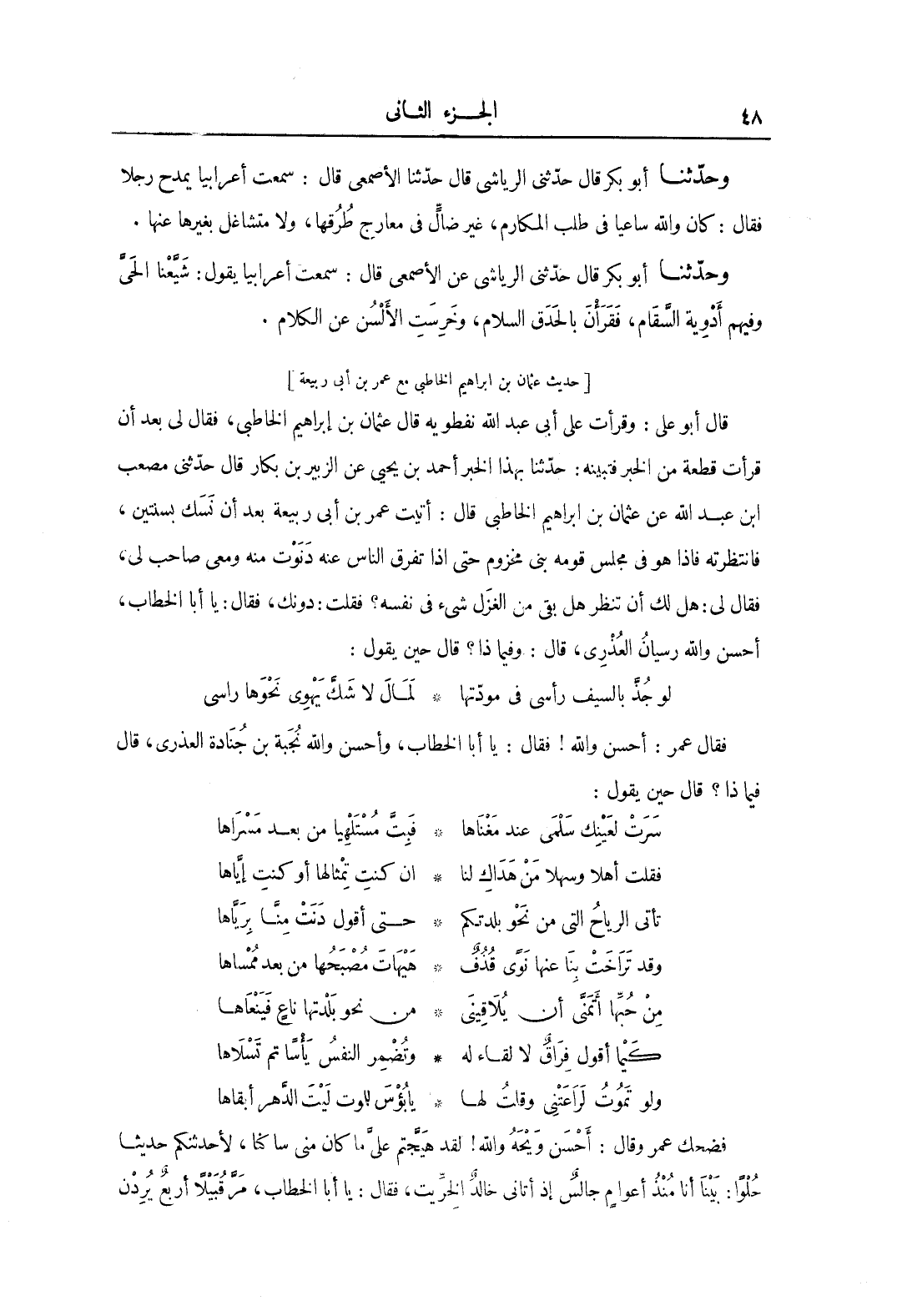 وقرأت عَلَى عبد الله نفطويه، قَالَ: عثمان بن إبراهيم الخاطبي، فقَالَ لي بعد أن قرأت قطعة من الخبر فتبينه حَدَّثَنَا بهذا الخبر أحمد بن يحيى، عَنِ الزبير بن بكار، قَالَ: حَدَّثَنِي مصعب بن عبد الله، عَنْ عثمان بن ابراهيم الخاطبي، قَالَ: أتيت عمر بن أبي ربيعة بعد أن نسك بسنتين، فانتظرته فإذا هو فِي مجلس قومه بني مخزوم حتى إذا تفرق الناس عنه دنوت منه ومعي صاحب لي، فقَالَ لي: هل لك أن تنظر هل بقي من الغزل شيء فِي نفسه؟ فقلت: دونك، فقَالَ: يا أبا الخطاب، أحسن والله رسيان العذري، فقَالَ: وفيما ذا؟ قَالَ حين يقول:
