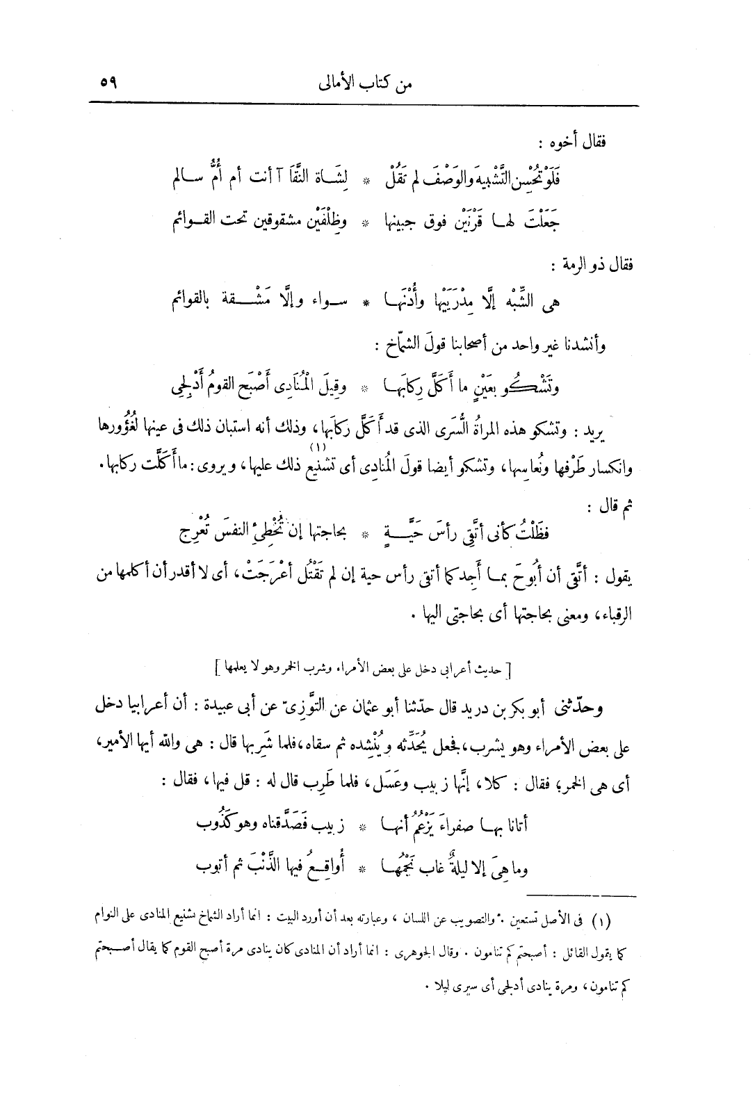 وحَدَّثَنِي أَبُو بَكْرِ بن دريد، قَالَ: حَدَّثَنَا أَبُو عثمان، عَنِ التوزى، عَنْ أبى عبيدة: أن أعرابياً دخل عَلَى بعض الأمراء وهو يشرب، فجعل يحدثه وينشده ثم سقاه، فلما شربها قَالَ: هي والله أيها الأمير، أي هي الخمر، فقَالَ: كلا، إنها زبيب وعسل، فلما قَالَ له قل فيها، فقَالَ: