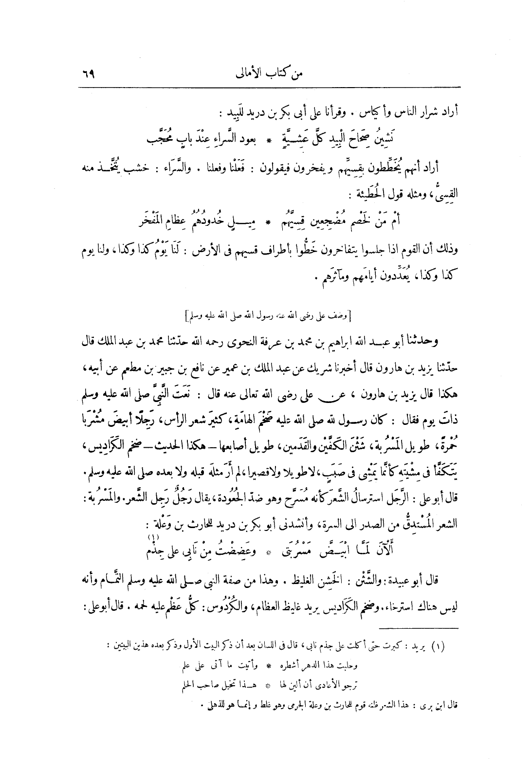 وَحَدَّثَنَا أَبُو عَبْدِ اللَّهِ إِبْرَاهِيمُ بْنُ مُحَمَّدِ بْنِ عَرَفَةَ النَّحْوِيُّ، رَحِمَهُ اللَّهُ، حَدَّثَنَا مُحَمَّدُ بْنُ عَبْدِ الْمَلِكِ، قَالَ: حَدَّثَنَا يَزِيدُ بْنُ هَارُونَ، قَالَ: أَخْبَرَنَا شَرِيكٌ، عَنْ عَبْدِ الْمَلِك بْنِ عُمَيْرٍ، عَنْ نَافِعِ بْنِ جُبَيْرِ بْنِ مُطْعِمٍ، عَنْ أَبِيهِ، هَكَذَا قَالَ يَزِيدُ بْنُ هَارُونَ، عَنْ عَلِيٍّ، رَضِيَ اللَّهُ عَنْهُ، قَالَ: نَعَتَ النَّبِيَّ صَلَّى اللهُ عَلَيْهِ وَسَلَّمَ ذَاتَ يَوْمٍ فَقَالَ: «كَانَ رَسُولُ اللَّهِ صَلَّى اللهُ عَلَيْهِ وَسَلَّمَ ضَخْمَ الْهَامَةِ، كَثِيرَ شَعَرِ الرَّأْسِ رَجِلا، أَبْيَضَ مُشْرَبًا حُمْرَةً، طَوِيلَ الْمَسْرُبَةِ، شَثْنَ الْكَفَّيْنِ وَالْقَدَمَيْنِ، طَوِيلَ أَصَابِعِهَا، هَكَذَا الْحديث، ضَخْمَ الْكَرَادِيسِ، يَتَكَفَّأُ فِي مِشْيَتِهِ كَأَنَّمَا يَمْشِي فِي صَبَبٍ، وَلا طَوِيلا وَلا قَصِيرًا، لَمْ أَرَ مِثْلَهُ قَبْلَهُ وَلا بَعْدَهُ صَلَّى اللهُ عَلَيْهِ وَسَلَّمَ» قال أبو علي: الرجل استرسال الشعر كأنه مسرّح وهو ضد الجعودة، يُقَال رجلٌ رَجِل الشعر.