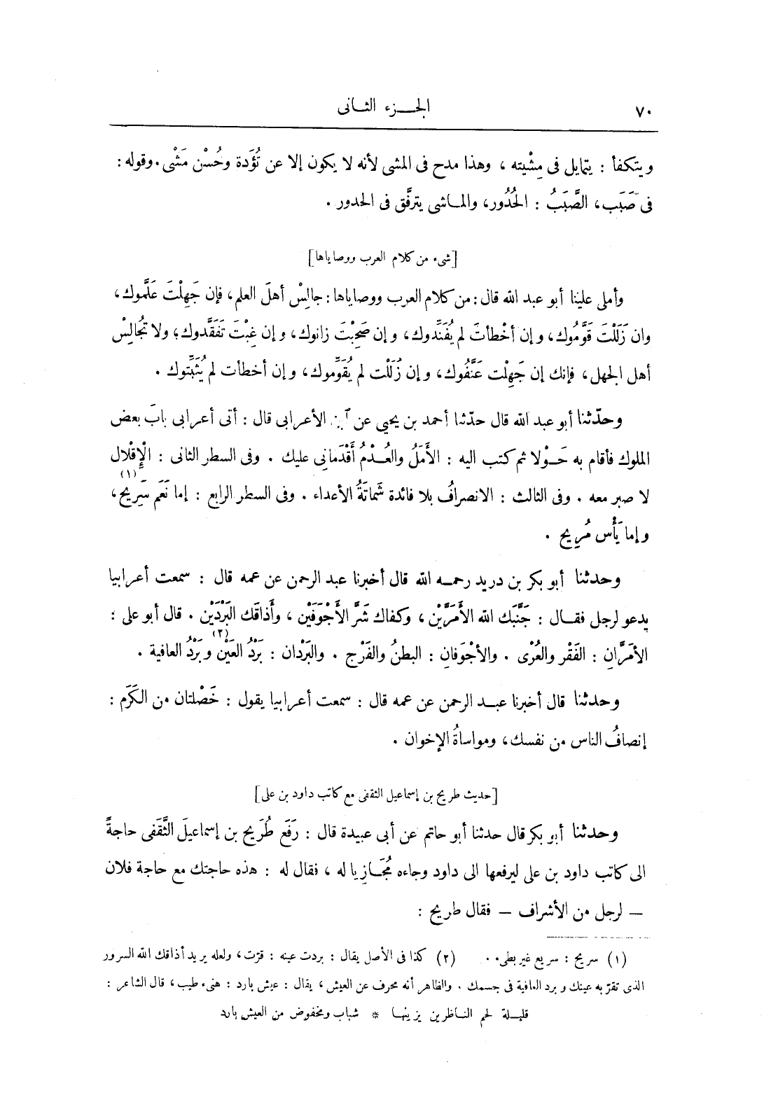 وحَدَّثَنَا أَبُو بَكْرِ بن دريد، رحمه الله، قَالَ: أَخْبَرَنَا عبد الرحمن، عَنْ عمه، قَالَ: سمعت أعرابياً يدعو لرجل فقَالَ: «جنبك الله الأمرين، وكفاك شر الأجوفين، وأذاقك البردين» الأمران: الفقر والعرى.