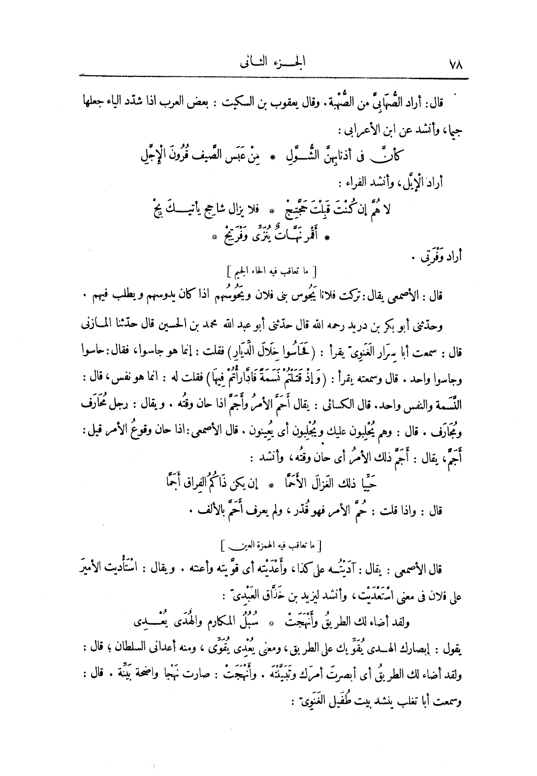 وحَدَّثَنِي أَبُو بَكْرٍِ، رحمه الله، قَالَ: حَدَّثَنِي أَبُو عبد الله بن الحسين، قَالَ: حَدَّثَنَا المازني، قَالَ: سمعت أبا سرار الغنوي، يقرأ: فحاسوا خلال الديار فقلت: إنما هو جاسوا فقَالَ: حاسوا وجاسوا واحد، قَالَ وسمعته يقرأ: وإذ قَتَلْتُمْ نَسَمَةً فَادَّارَأْتُمْ فِيهَا فقلت له: إنما هو نفس، قَالَ: النسمة والنفس واحد قَالَ الكسائي: يُقَال أحم الأمر وأجم إذا حان وقته، ويقَالَ: رجل محارف ومجارف، قَالَ: وهم يحلبون عليك، ويجلبون أي: يعينون، قَالَ الأصمعي: إذا حان وقوع الأمر قيل: أجمّ، يُقَال: أجمّ ذلك الأمر أي: حان وقته، وأنشد: