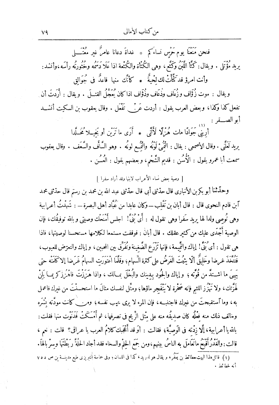 وحَدَّثَنَا أَبُو بَكْرِ بن الأنبارى، قَالَ: حَدَّثَنِي أبى، قَالَ: حَدَّثَنِي عبد الله بن محمد بن رستم، قَالَ: حَدَّثَنِي محمد بن قادم النحوي، قَالَ: قَالَ أبان بن تغلب، وكان عابداً من عباد أهل البصرة، شهدت أعرابية وهي توصي ولدًا لها يريد سفراً وهي تقول له: أي بني! اجلس أمنحك وصيتي وبالله توفيقك، فإن الوصية أجدى عليك من كثير عقلك، قَالَ أبان: فوقفت مستمعاً لكلامها مستحسناً لوصيتها، فإذا هي تقول: أي بني! إياك والنميمة، فإنها تزرع الضغينة وتفرق بين المحبين، وإياك والتعرض للعيوب، فتتخذ غرضاً وخليقٌ إلا يثبت الغرض عَلَى كثرة السهام، وقلما اعتورت السهام غرضاً إلا كلمته حتى يهي ما اشتد من قوته، وإياك والجود بدينك والبخل بمالك، وإذا هززت فاهزز كريماً يلن لهزتك، ولا تهزز اللئيم فإنه صخرة لا ينفجر ماؤها، ومثل لنفسك مثال ما استحسنت من غيرك فاعمل به، وما استقبحت من غيرك فاجتنبه، فإن المرء لا يرى عيب نفسه، ومن كانت مودته بشره، وخالف ذلك منه فعله كان صديقه منه عَلَى مثل الريح فِي تصرفها، ثم أمسكت فدنوا منها فقلت: بالله يا أعرابية، إلا زدته فِي الوصية، فقَالَت: والغدر أقبح ما تعامل به الناس بينهم، ومن جمع الحلم والسخاء فقد اجاد الحلة ريطتها وسربالها