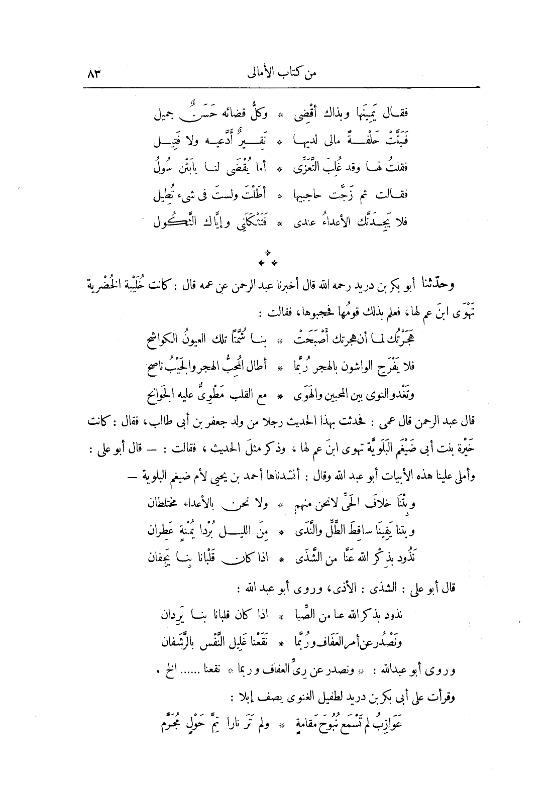وحَدَّثَنَا أَبُو بَكْرِ بن دريد، رحمه الله، قَالَ: أَخْبَرَنَا عبد الرحمن، عَنْ عمه، قَالَ: كانت خليبة الحضرية تهوى ابن عم لها، فعلم بذلك قومها فحجبوها، فقَالَت: