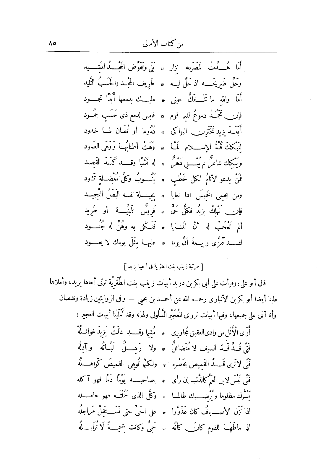 وقرأت عَلَى أَبِي بَكْرِ بن دريد، أبيات زينب بنت الطثرية، ترثي أخاها يزيد، وأملاها علينا أيضاً أَبُو بَكْرِ بن الأنبارى، رحمه الله، عَنْ أحمد بن يحيى، وفي الروايتين زيادة ونقصان، وأنا آتي عَلَى جميعها، وفيها أبيات تروى للعجير السلولي ولها، وقد أملينا أبيات العجير: