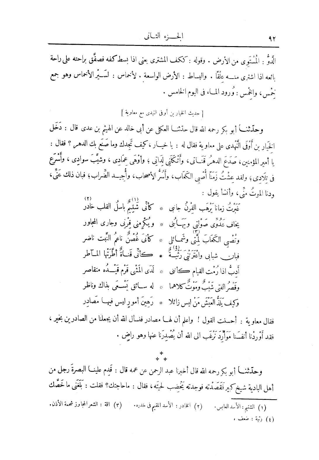 وحَدَّثَنَا أَبُو بَكْرٍِ، رحمه الله، قَالَ: حَدَّثَنَا العكلي، عَنْ أبي خالد، عَنِ الهيثم بن عدي، قَالَ: دخل الخيار بن أوفى النَّهدي عَلَى معاوية فقَالَ له: يا خيار، كيف تجدك وما صنع بك الدهر؟ فقَالَ: يا أمير المؤمنين، صدع الدهر قناتي، وأثكلني لداتي، وأوهى عمادي، وشيب سوادي، وأسرع فِي تلادي، ولقد عشت زمناً أُصبي الكعاب، وأسر الأصحاب، وأُجيد الضّراب، فبان ذلك عني، ودنا الموت مني، وأنشأ يقول: