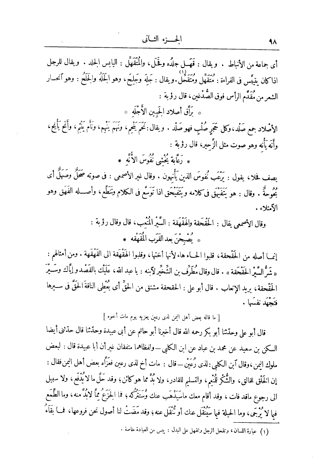 أي جماعة من الأنباط، ويقَالَ: قهل جلده وقحل، والمتقهل: اليابس الجلد، ويقَالَ للرجل إذا كان يتيبس فِي القراءة: متقهل ومتقحل، ويقَالَ: جلة وجلح، وهو الجله والجلح: وهو انحسار الشعر من مقدم الرأس فوق الصدغين، قَالَ رؤبة:
