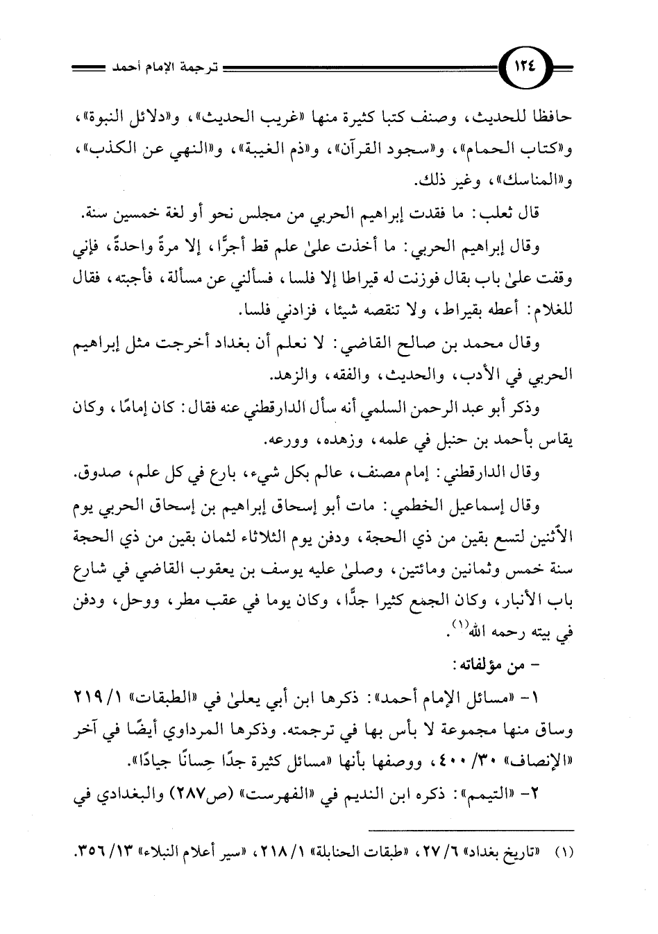 (¬1) "تاريخ بغداد" 6/ 27، "طبقات الحنابلة" 1/ 218، "سير أعلام النبلاء" 13/ 356.
