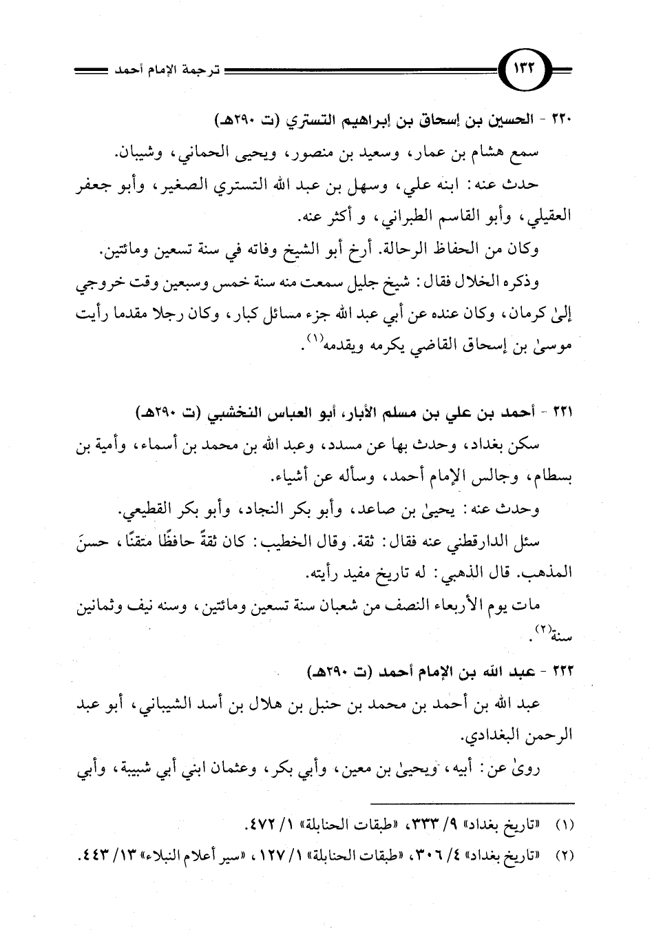 (¬2) "تاريخ بغداد" 4/ 306، "طبقات الحنابلة" 1/ 127، "سير أعلام النبلاء" 13/ 443.