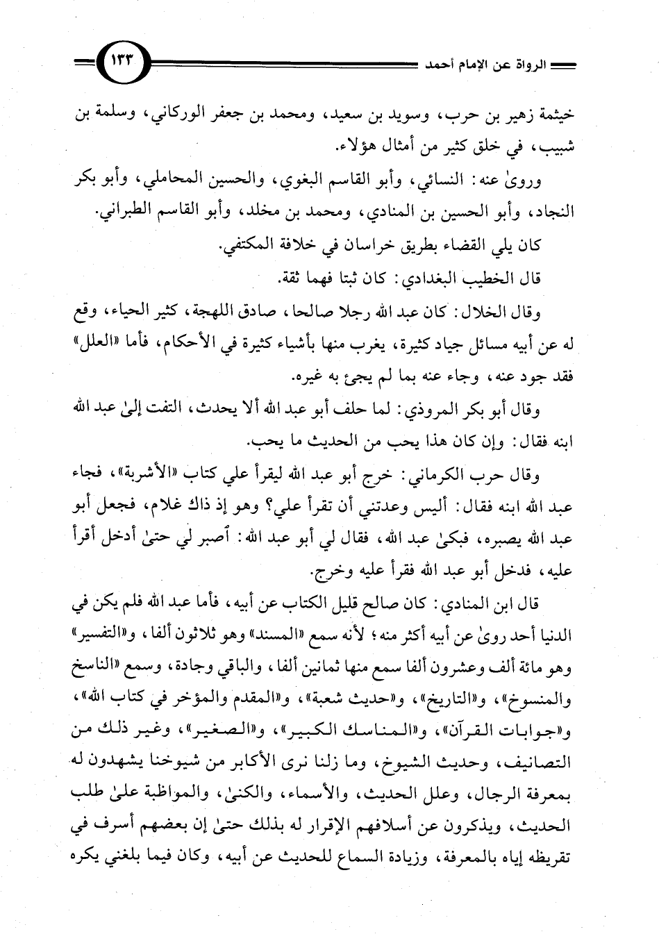 وقال الخلال: كان عبد اللَّه رجلا صالحا، صادق اللهجة، كثير الحياء، وقع له عن أبيه مسائل جياد كثيرة، يغرب منها بأشياء كثيرة في الأحكام، فأما "العلل" فقد جود عنه، وجاء عنه بما لم يجئ به غيره.