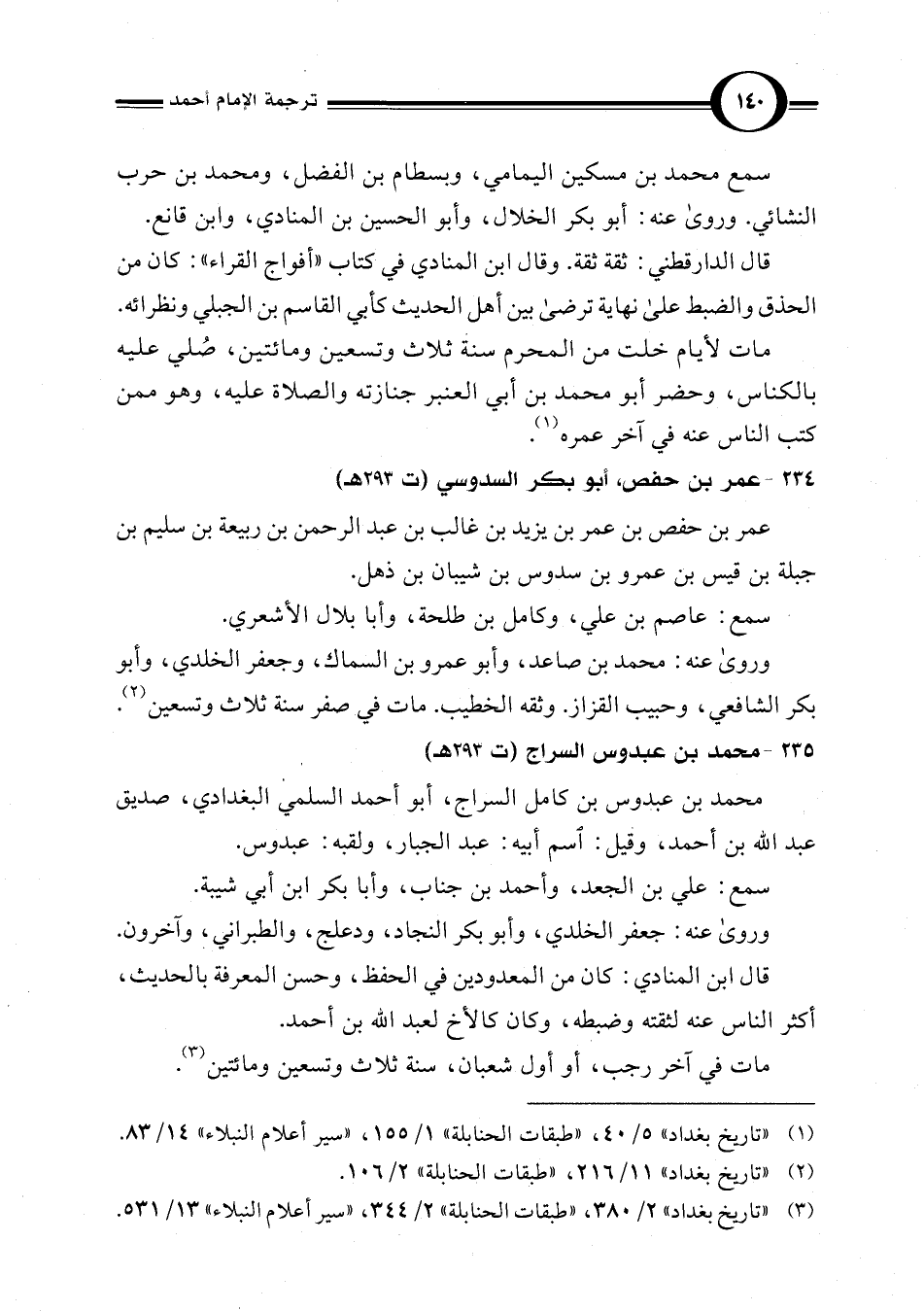 (¬1) "تاريخ بغداد" 5/ 40، "طبقات الحنابلة" 1/ 155، "سير أعلام النبلاء" 14/ 83.