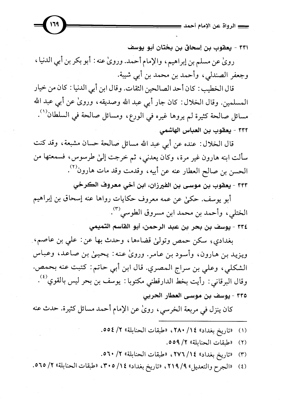 (¬4) "الجرح والتعديل" 9/ 219، "تاريخ بغداد" 14/ 305، "طبقات الحنابلة" 2/ 565.