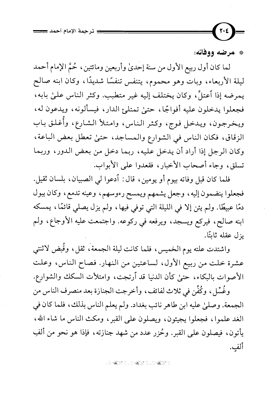 لما كان أول ربيع الأول من سنة إحدى وأربعين ومائتين، حُمَّ الإمام أحمد ليلة الأربعاء، وبات وهو محموم، يتنفس تنفسًا شديدًا، وكان ابنه صالح يمرضه إذا اعتلَّ، وكان يختلف إليه غير متطبب. وكثر الناس على بابه، فجعلوا يدخلون عليه أفواجًا، حتى تمتلئ الدار، فيسألونه، ويدعون له، ويخرجون، ويدخل فوج، وكثر الناس، وامتلأ الشارع، وأُغلق باب الزقاق، فكان الناس في الشوارع والمساجد، حتى تعطل بعض الباعة، وكان الرجل إذا أراد أن يدخل عليه، ربما دخل من بعض الدور، وربما تسلق، وجاء أصحاب الأخبار، فقعدوا على الأبواب.