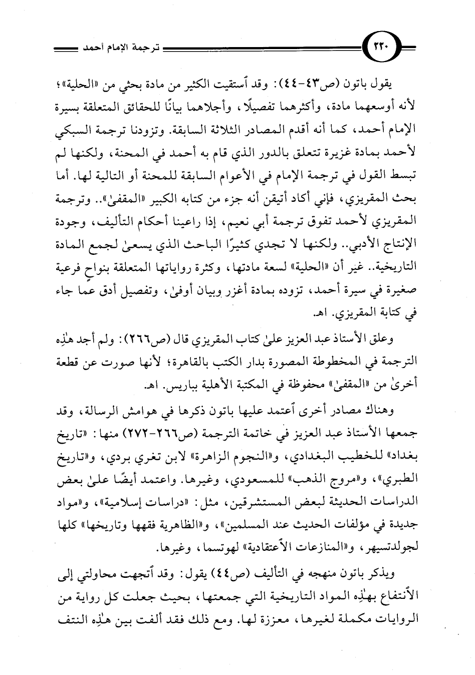 يقول باتون (ص 43 - 44): وقد استقيت الكثير من مادة بحثي من "الحلية"؛ لأنه أوسعهما مادة، وأكثرهما تفصيلًا، وأجلاهما بيانًا للحقائق المتعلقة بسيرة الإمام أحمد، كما أنه أقدم المصادر الثلاثة السابقة. وتزودنا ترجمة السبكي لأحمد بمادة غزيرة تتعلق بالدور الذي قام به أحمد في المحنة، ولكنها لم تبسط القول في ترجمة الإمام في الأعوام السابقة للمحنة أو التالية لها. أما بحث المقريزي، فإني أكاد أتيقن أنه جزء من كتابه الكبير "المقفى". . وترجمة المقريزي لأحمد تفوق ترجمة أبي نعيم، إذا راعينا أحكام التأليف، وجودة الإنتاج الأدبي. . ولكنها لا تجدي كثيرًا الباحث الذي يسعى لجمع المادة التاريخية. . غير أن "الحلية" لسعة مادتها، وكثرة رواياتها المتعلقة بنواحٍ فرعية صغيرة في سيرة أحمد، تزوده بمادة أغزر وبيان أوفى، وتفصيل أدق عما جاء في كتابة المقريزي. اهـ.