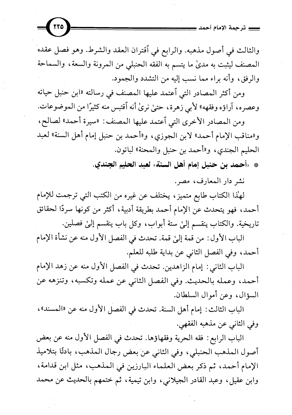 لهذا الكتاب طابع متميز، يختلف عن غيره من الكتب التي ترجمت للإمام أحمد، فهو يتحدث عن الإمام أحمد بطريقة أدبية، أكثر من كونها سردًا لحقائق تاريخية. والكتاب ينقسم إلى ستة أبواب، وكل باب ينقسم إلى فصلين.