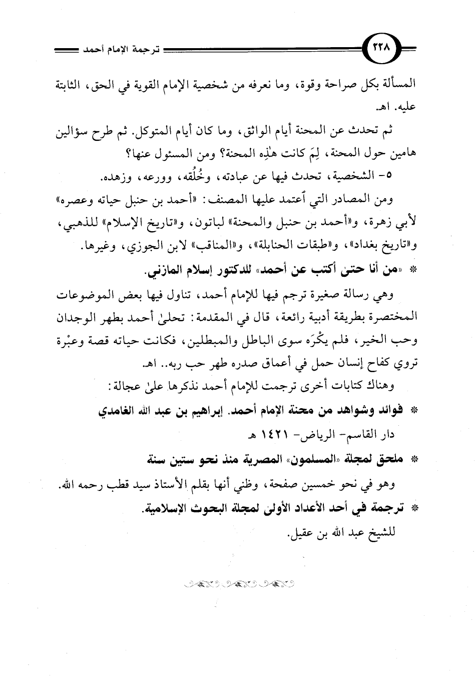 وهي رسالة صغيرة ترجم فيها للإمام أحمد، تناول فيها بعض الموضوعات المختصرة بطريقة أدبية رائعة، قال في المقدمة: تحلى أحمد بطهر الوجدان وحب الخير، فلم يكْرَه سوى الباطل والمبطلين، فكانت حياته قصة وعبْرة تروي كفاح إنسان حمل في أعماق صدره طهر حب ربه. . اهـ.