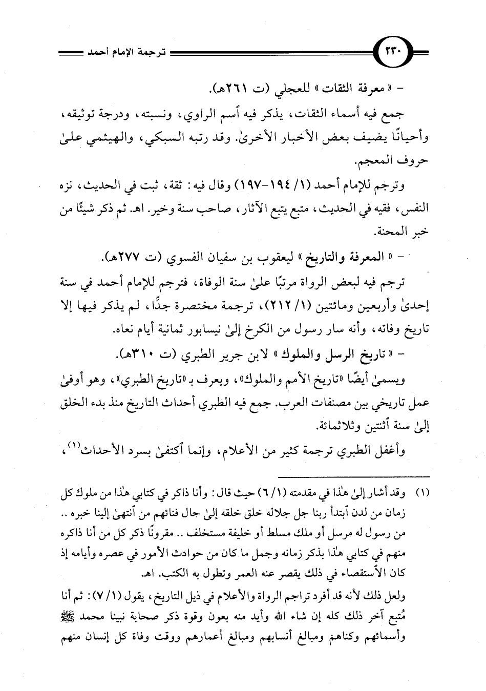 وترجم للإمام أحمد (1/ 194 - 197) وقال فيه: ثقة، ثبت في الحديث، نزه النفس، فقيه في الحديث، متبع يتبع الآثار، صاحب سنة وخير. اهـ. ثم ذكر شيئًا من خبر المحنة.