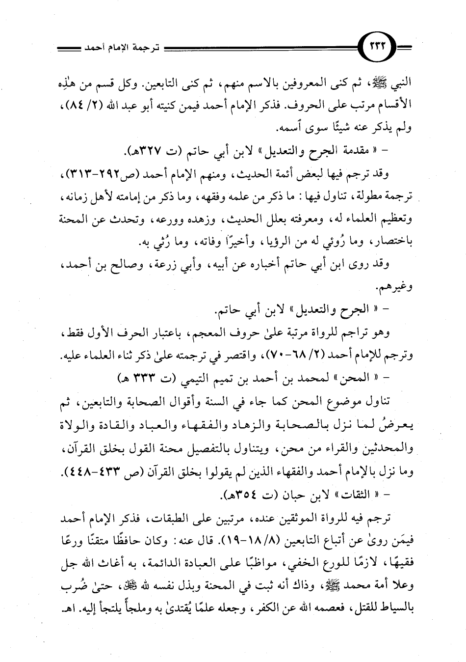 ترجم فيه للرواة الموثقين عنده، مرتبين على الطبقات، فذكر الإمام أحمد فيمَن روى عن أتباع التابعين (8/ 18 - 19). قال عنه: وكان حافظًا متقنا ورعًا فقيهًا، لازمًا للورع الخفي، مواظبًا على العبادة الدائمة، به أغاث اللَّه جل وعلا أمة محمد -صلى اللَّه عليه وسلم-، وذاك أنه ثبت في المحنة وبذل نفسه للَّه عز وجل، حتى ضُرب بالسياط للقتل، فعصمه اللَّه عن الكفر، وجعله علمًا يُقتدى به وملجأً يلتجأ إليه. اهـ.