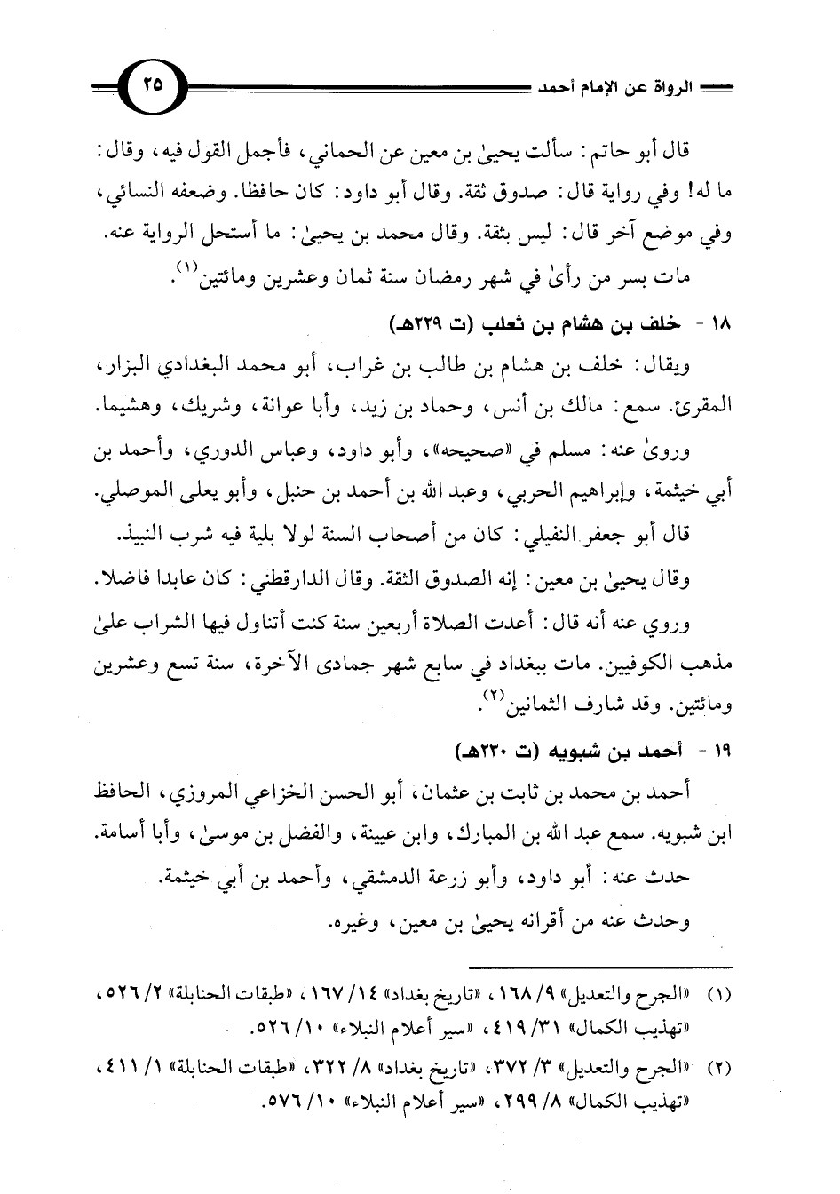 (¬2) "الجرح والتعديل" 3/ 372، "تاريخ بغداد" 8/ 322، "طبقات الحنابلة" 1/ 411، "تهذيب الكمال" 8/ 299، "سير أعلام النبلاء" 10/ 576.