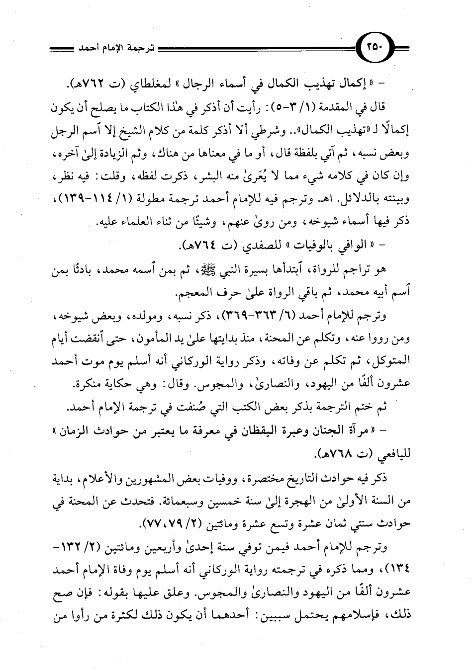 ثم ختم الترجمة بذكر بعض الكتب التي صُنفت في ترجمة الإمام أحمد.