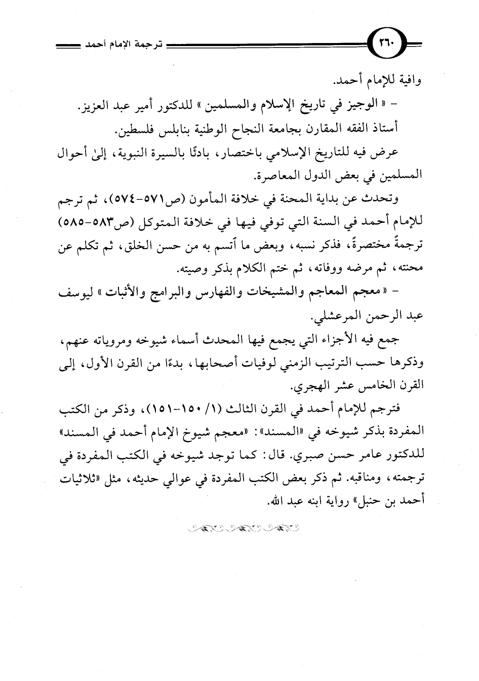 فترجم للإمام أحمد في القرن الثالث (1/ 150 - 151)، وذكر من الكتب المفردة بذكر شيوخه في "المسند": "معجم شيوخ الإمام أحمد في المسند" للدكتور عامر حسن صبري. قال: كما توجد شيوخه في الكتب المفردة في ترجمته، ومناقبه. ثم ذكر بعض الكتب المفردة في عوالي حديثه، مثل "ثلاثيات أحمد بن حنبل" رواية ابنه عبد اللَّه.