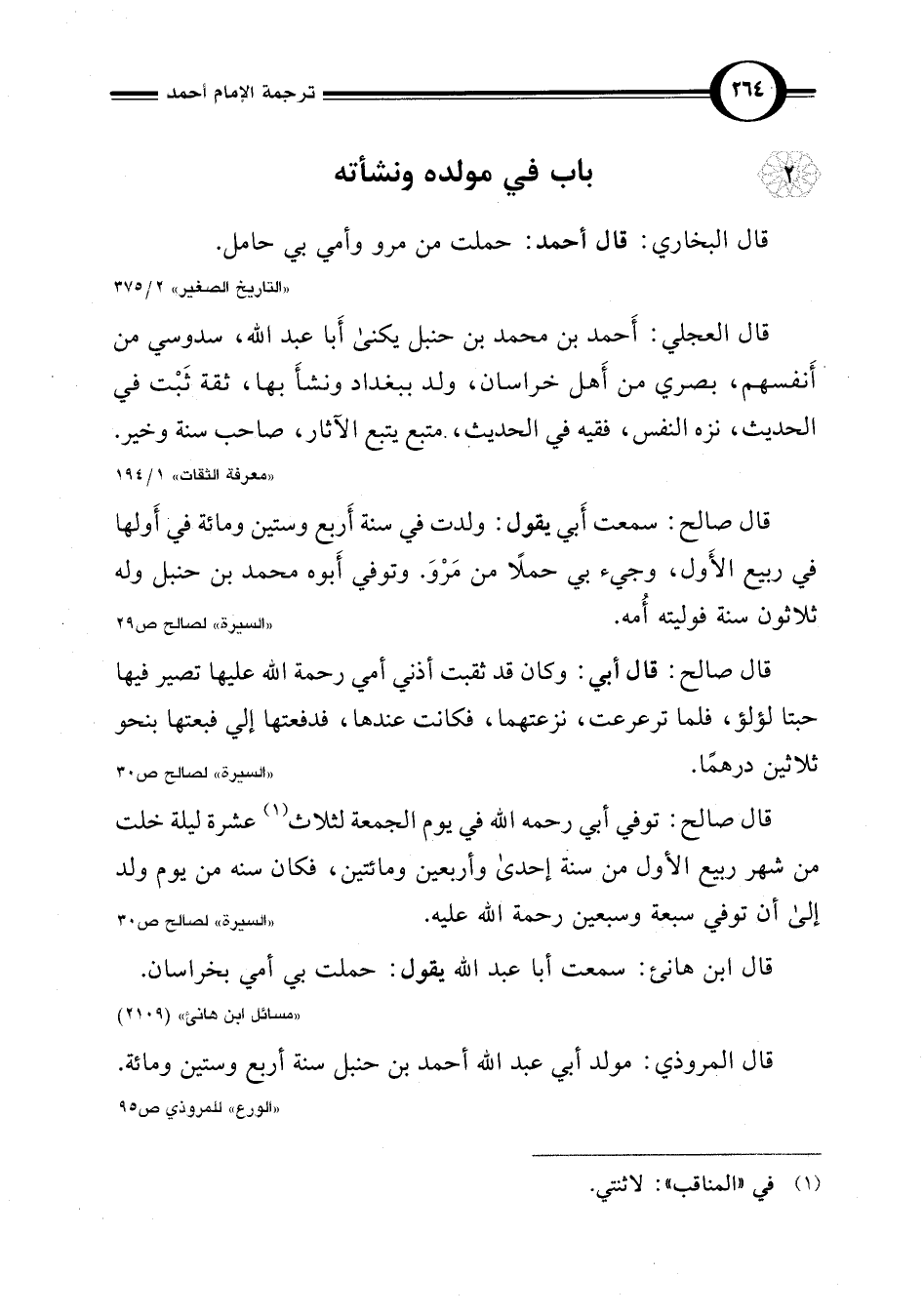 قال المروذي: مولد أبي عبد اللَّه أحمد بن حنبل سنة أربع وستين ومائة.